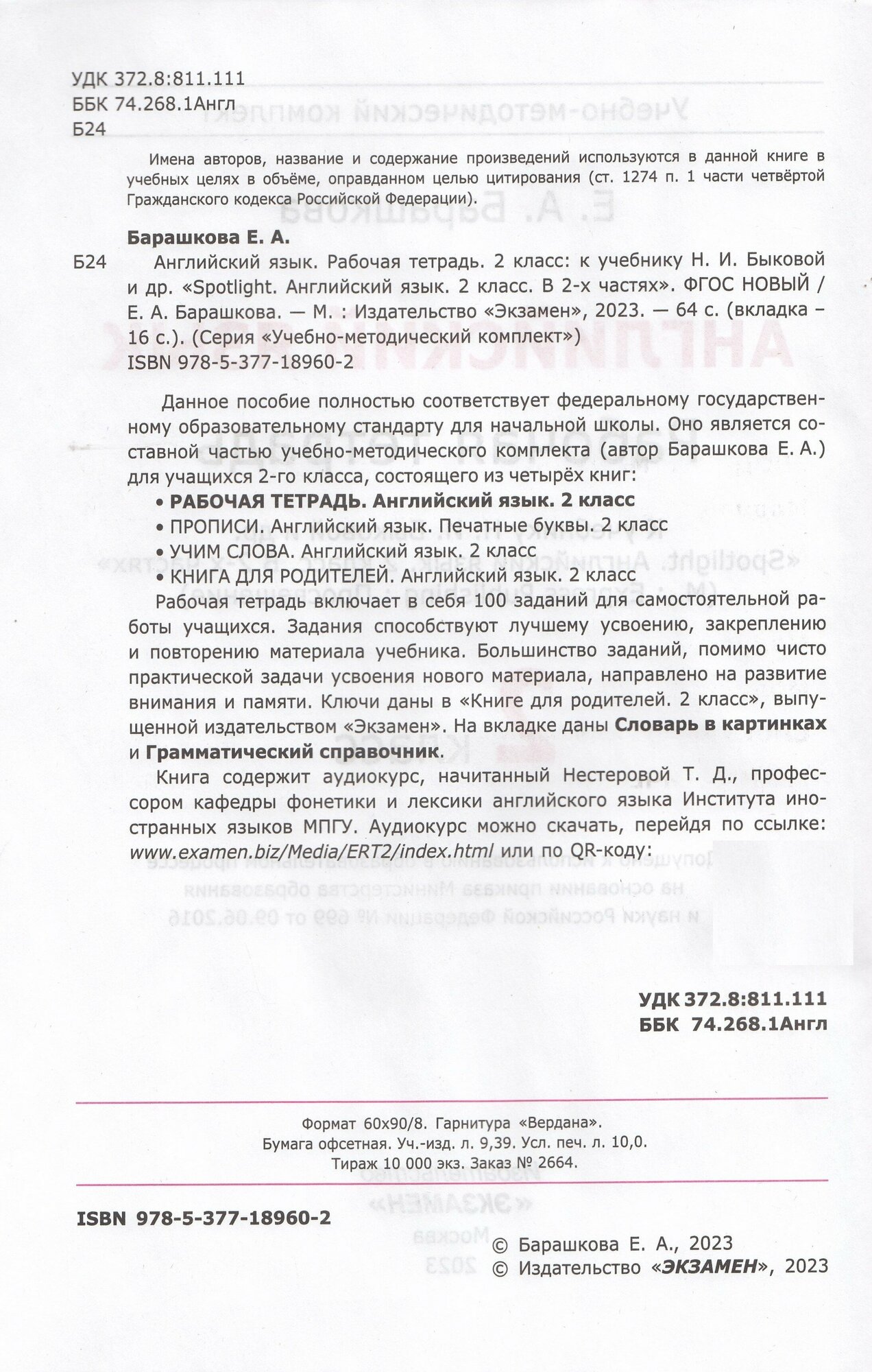 Английский язык. 2 класс. Рабочая тетрадь. К учебнику Н.И.Быковой Spotlight (Барашкова Елена Александровна); Экзамен Издательство, 2023