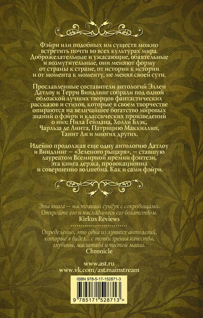 Фэйри или подобных им существ можно встретить почти во всех культурах мира. Доброжелательные и ужасающие, обаятельные и возмутительные, они меняют форму от страны к стране, от истории к истории и от момента к моменту, не меняя своей сути. Прославленные составители антологий Эллен Датлоу и Терри Виндлинг собрали под одной обложкой лучших творцов фантастических рассказов и стихов, которые в своем творчестве опираются на величайшее богатство мировых знаний о фэйри и классических произведений о них: Нила Геймана, Холли Блэк, Чарльза Де Линта, Патрицию Маккиллип, Танит Ли и многих других.