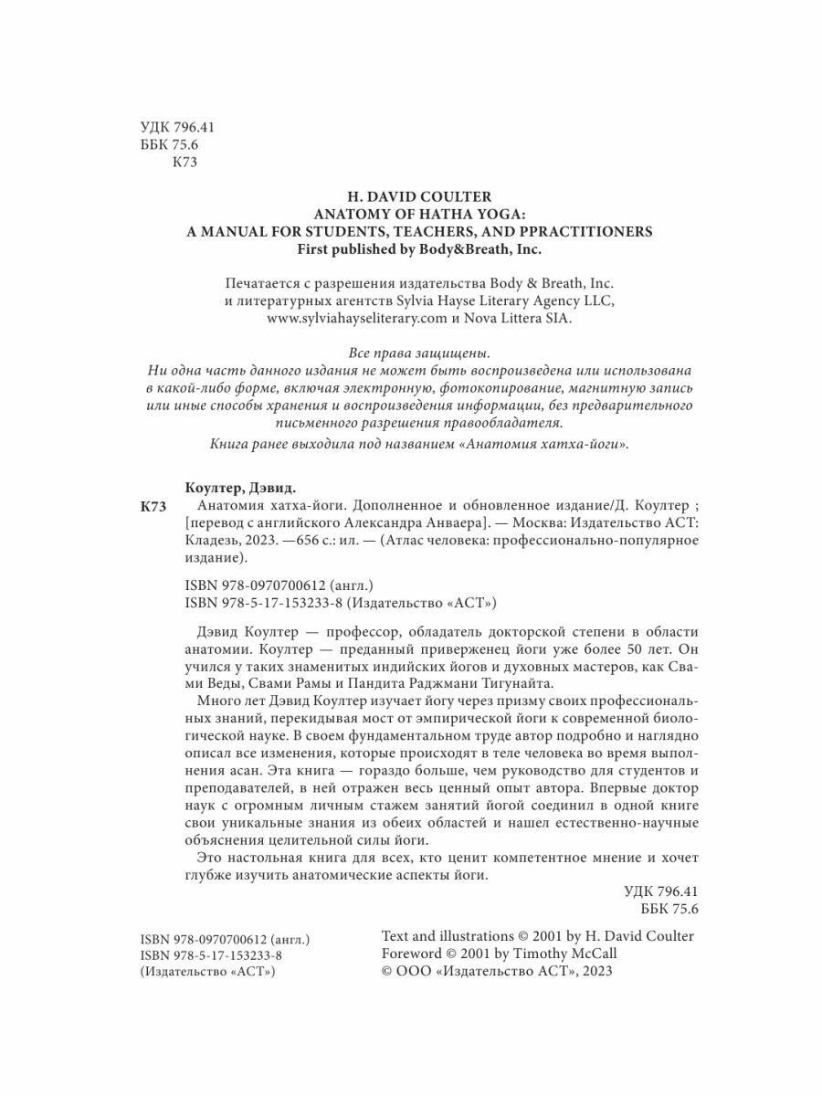 Много лет Дэвид Коултер изучает йогу через призму своих профессиональных знаний, перекидывая мост от эмпирической йоги к современной биологической науке. В своем фундаментальном труде автор подробно и наглядно описал все изменения, которые происходят в теле человека во время выполнения асан. Эта книга - гораздо больше, чем руководство для студентов и преподавателей, в ней отражен весь ценный опыт автора. Впервые доктор наук с огромным личным стажем занятий йогой соединил в одной книге свои уникальные знания из обеих областей и нашел естественно-научные объяснения целительной силы йоги.
