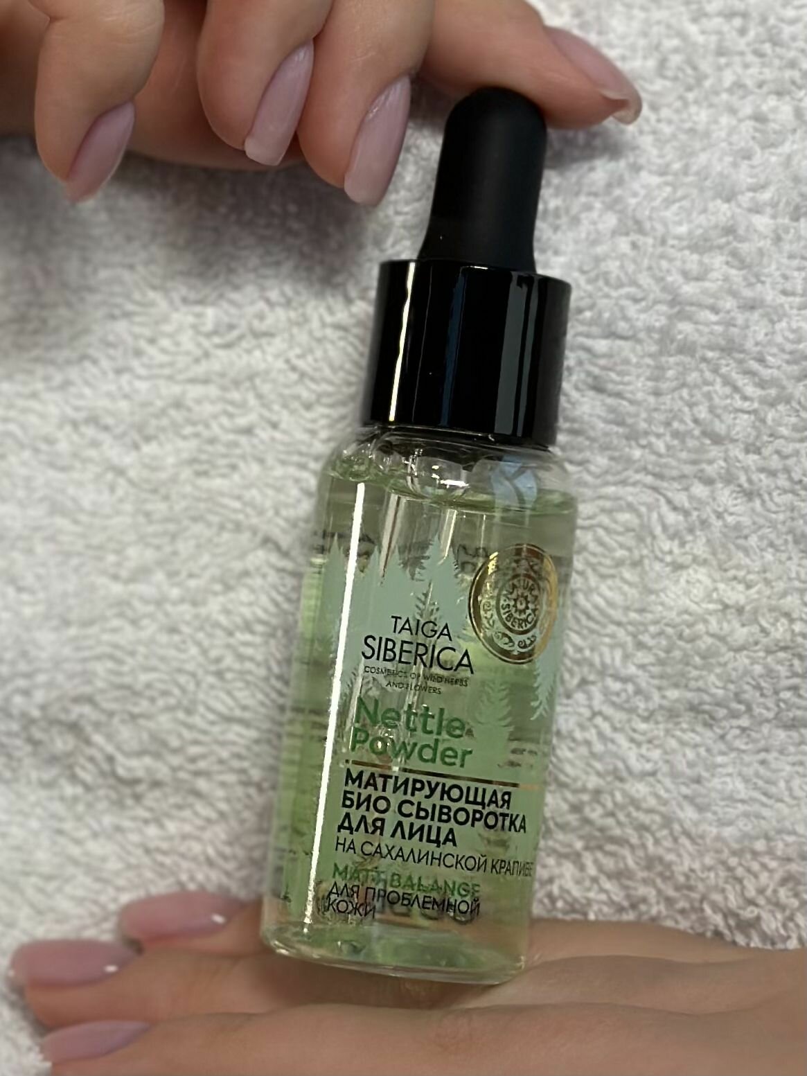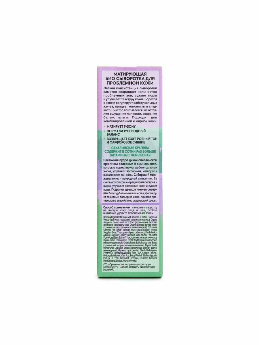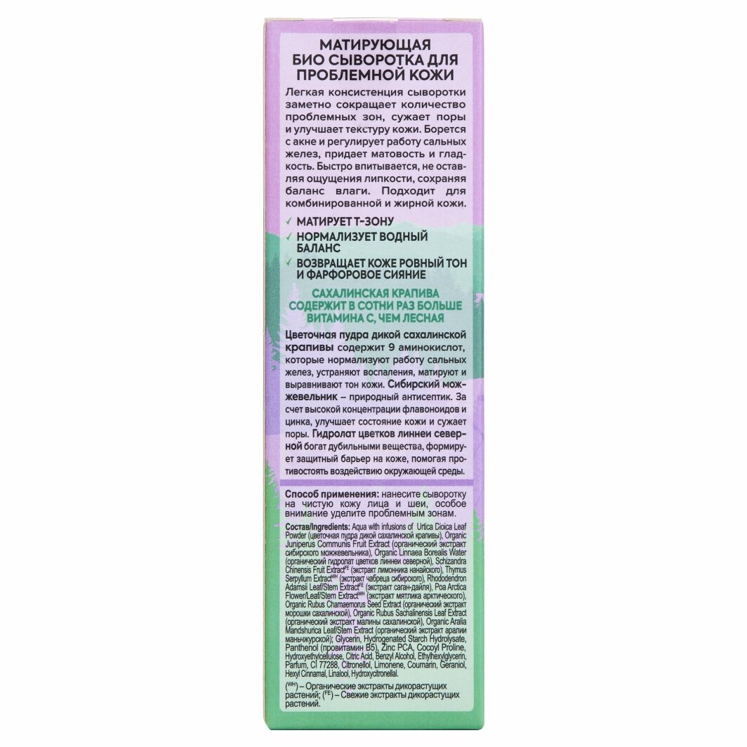 МАТИРУЮЩАЯ БИО СЫВОРОТКА ДЛЯ ЛИЦА MATT BALANCE ДЛЯ ПРОБЛЕМНОЙ КОЖИ Легкая консистенция сыворотки заметно сокращает количество проблемных зон, сужает поры и улучшает текстуру кожи. Борется с акне и регулирует работу сальных желез, придает матовость и гладкость. Быстро впитывается, не оставляя ощущения липкости, сохраняя баланс влаги. Подходит для комбинированной и жирной кожи. Матирует Т-зону. Нормализует водный баланс. Возвращает коже ровный тон и фарфоровое сияние САХАЛИНСКАЯ КРАПИВА СОДЕРЖИТ В СОТНИ РАЗ БОЛЬШЕ ВИТАМИНА С, ЧЕМ ЛЕСНАЯ Цветочная пудра дикой сахалинской крапивы содержит 9 аминокислот, которые нормализуют работу сальных желез, устраняют воспаления, матируют и выравнивают тон кожи. Сибирский можжевельник природный антисептик. За счет высокой концентрации флавоноидов и цинка, улучшает состояние кожи и сужает поры. Гидролат цветков линнеи северной богат дубильными вещества, формирует защитный барьер на коже, помогая противостоять воздействию окружающей среды.