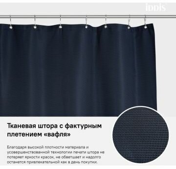 Текстильная штора из линейки Decor естественного темно-синего оттенка поддерживает современный тренд на натуральность в интерьере. Модель изготовлена из 100% износостойкого полиэстера с водоотталкивающей пропиткой – при попадании на ткань вода не впитывается, а скатывается с нее каплями. Тканевая штора с фактурным рисунком «вафля» смотрится невероятно свежо и актуально. ?Прочные хромированные люверсы (12 шт.) эффектно завершают облик изделия. С течением времени они не деформируются, не будут ржаветь сами или оставлять ржавых разводов на ткани. ?Уход за шторой для ванной IDDIS® прост и необременителен. Изделие можно стирать в стиральной машине как обычный домашний текстиль, оно не требует глажки – достаточно после стирки просто повесить его на карниз. ?Благодаря высокой плотности материала и усовершенствованной технологии печати штора IDDIS® не потеряет яркости красок, не обветшает и надолго останется привлекательной как в день покупки. ?Гарантия на текстильные аксессуары IDDIS® – 1 год.