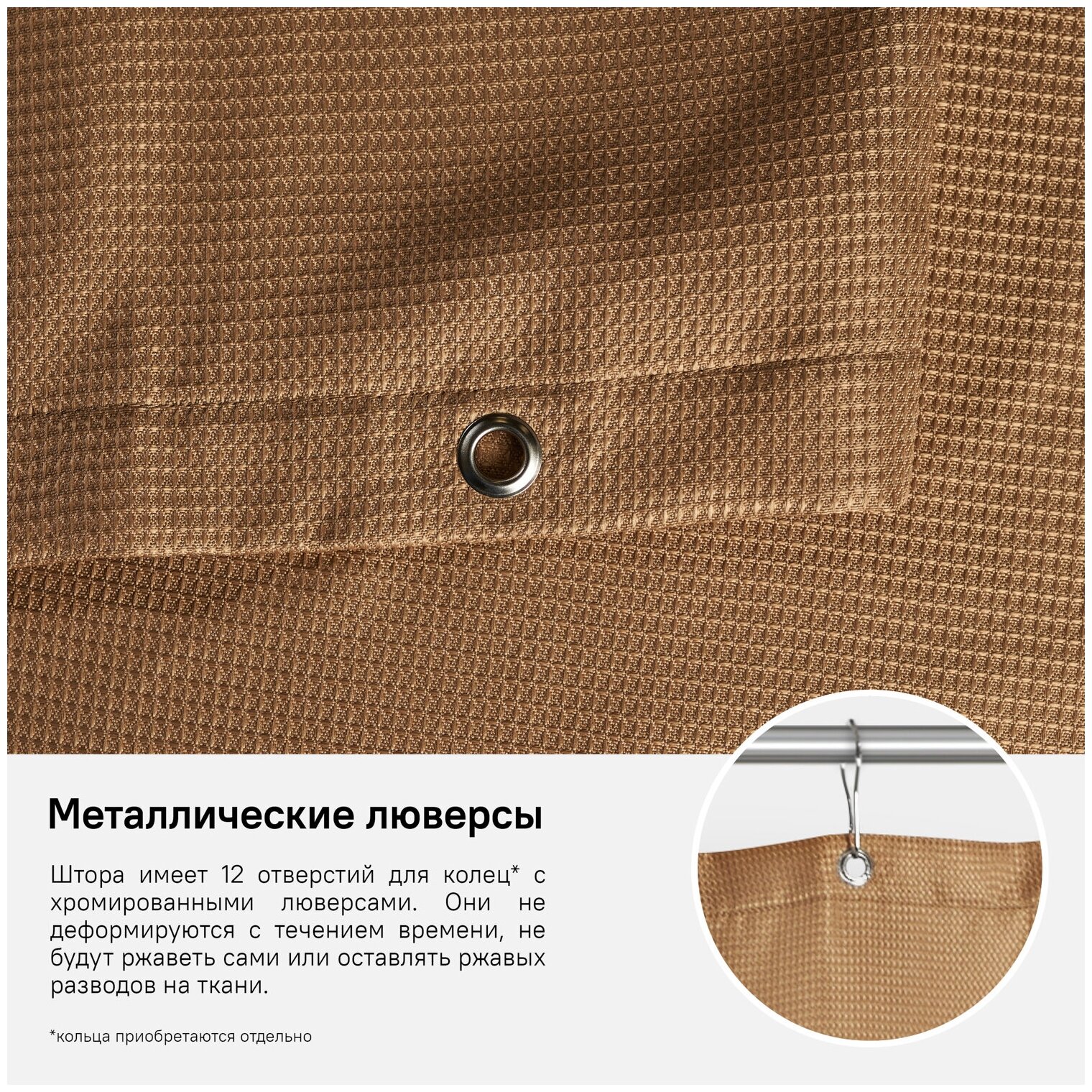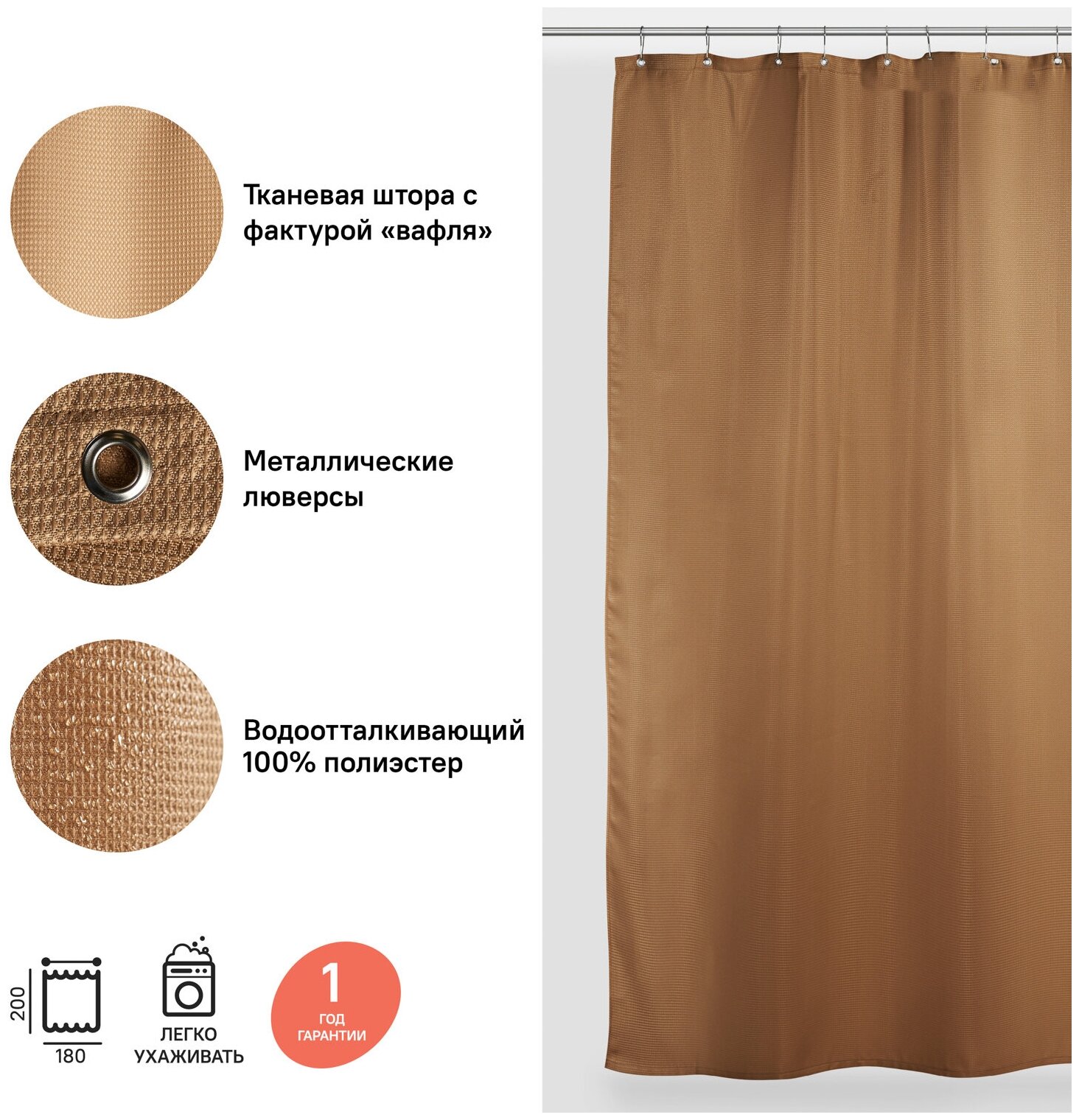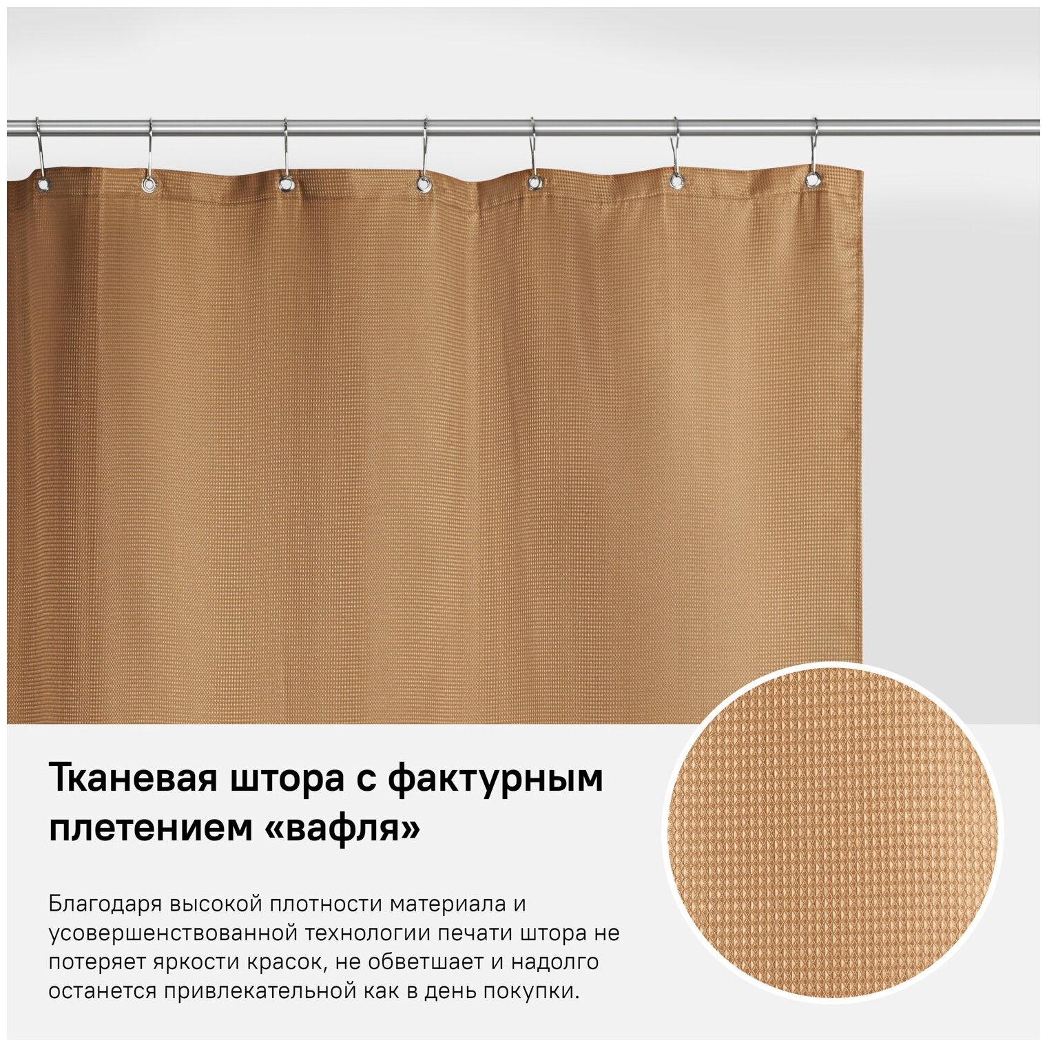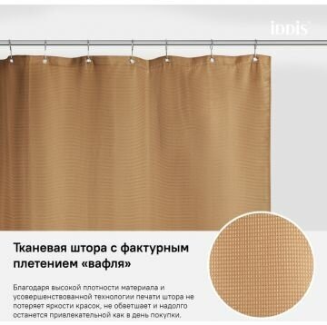 Текстильная штора из линейки Decor естественного цвета какао поддерживает современный тренд на натуральность в интерьере. Модель изготовлена из 100% износостойкого полиэстера с водоотталкивающей пропиткой – при попадании на ткань вода не впитывается, а скатывается с нее каплями. Тканевая штора с фактурным рисунком «вафля» смотрится невероятно свежо и актуально. ?Прочные хромированные люверсы (12 шт.) эффектно завершают облик изделия. С течением времени они не деформируются, не будут ржаветь сами или оставлять ржавых разводов на ткани. ?Уход за шторой для ванной IDDIS® прост и необременителен. Изделие можно стирать в стиральной машине как обычный домашний текстиль, оно не требует глажки – достаточно после стирки просто повесить его на карниз. ?Благодаря высокой плотности материала и усовершенствованной технологии печати штора IDDIS® не потеряет яркости красок, не обветшает и надолго останется привлекательной как в день покупки. ?Гарантия на текстильные аксессуары IDDIS® – 1 год.