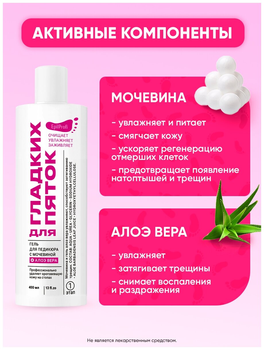 | Полное описание | Гель для педикюра EpilProfi помогает легко убрать мозоли и огрубевшие участки, делая кожу стоп гладкой, нежной, мягкой. Размягчитель с соком листа алоэ вера, мочевиной и глицерином, обеспечивает бережный уход пальцами и пятками. Чистить кожу с его помощью легко.Другие педикюрные инструменты и принадлежности (пилка, скребок, щетка, гелевые скрабы, терка) не потребуются. Идеальный подарочный косметический набор будет намного эффективнее для размягчения стоп, снятия ороговевших частиц и устранения трещин в домашних условиях, чем такие товары и косметика как жидкий пилинг лосьон, мазь, ванночки, отшелушивающий бальзам, разная жидкость. |