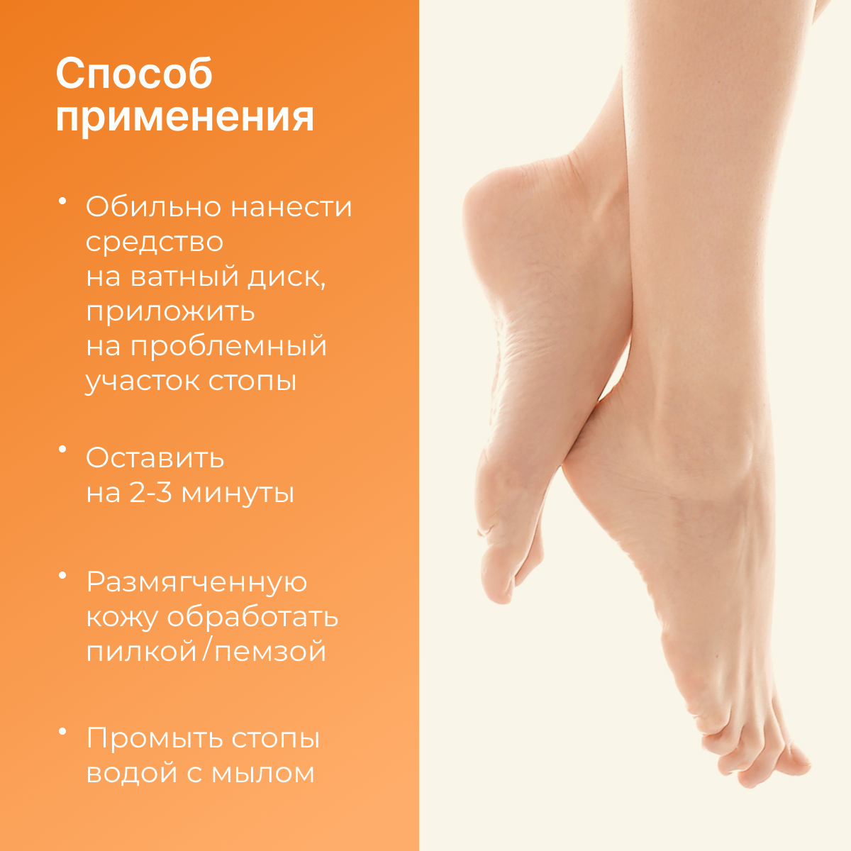 | Способ применения | Обильно нанести средство на ватный диск, приложить на проблемный участок стопы Оставить на 2-3 минуты Размягченную кожу обработать пилкой/пемзой Промыть стопы водой Смазать увлажняющим кремомДля достижения желаемого результата повторить процедуру до 5 раз. Работать в перчатках, избегать попадания на поврежденные и чувствительные участки кожи, слизистые оболочки глаз. При попадании тщательно промыть под струей воды (с применением мыльного раствора). Хранить в недоступном для детей месте. |