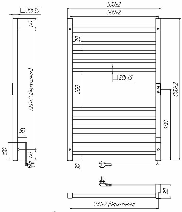 | ВКоробке | Полотенцесушитель - 1 шт. Терморегулятор - 1 шт. Комплект креплений - 1 шт. Комплект декоративных заглушек - 1 шт. Электрический кабель - 1 шт. Инструкция - 1 шт. |