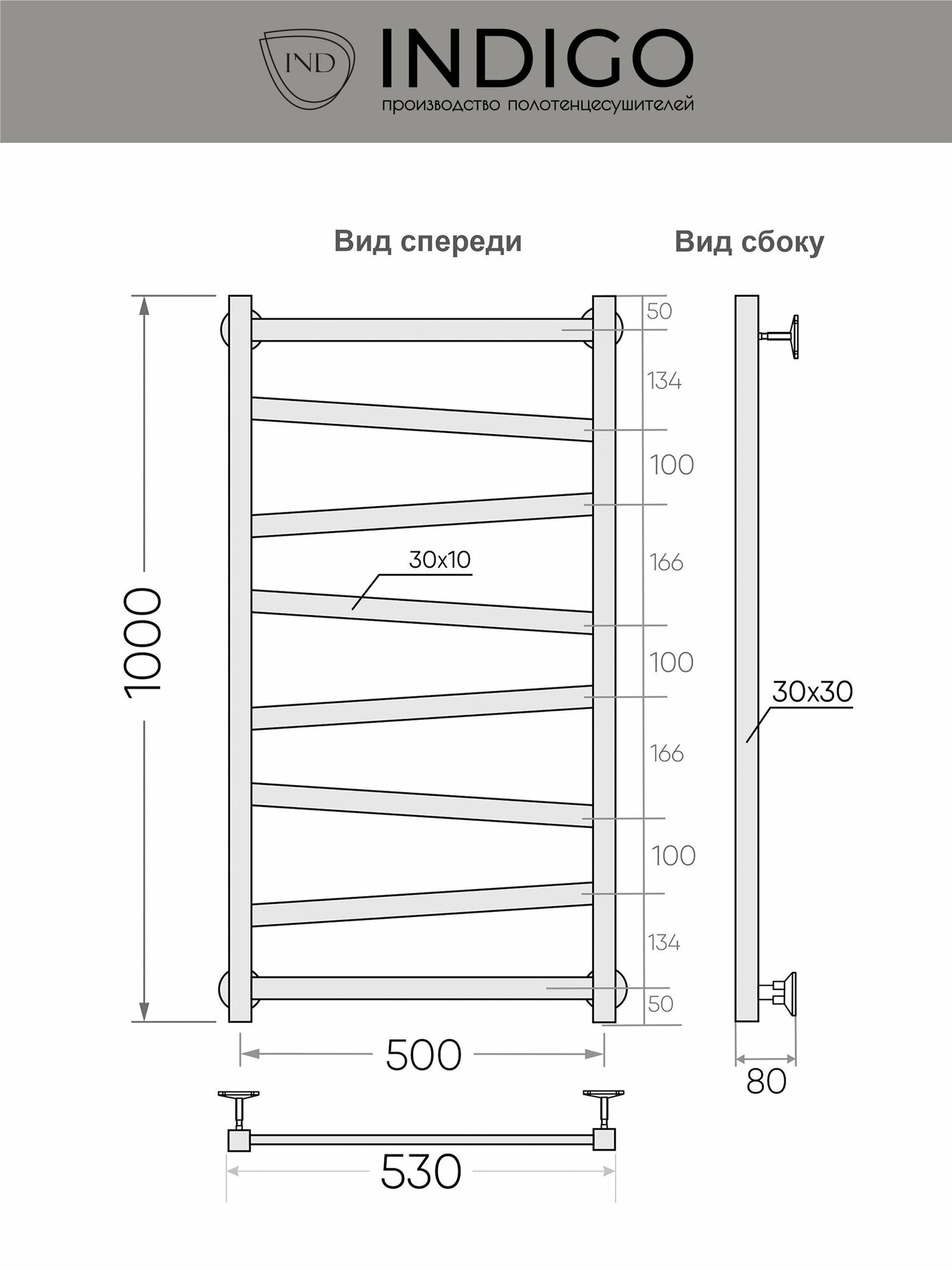 Полотенцесушитель водяной INDIGO Element в размере 1000х500 (ВхШ) выбирают за его не симметричную установку перекладин. Модель изготовлена из высококачественной нержавеющей стали. Качественная металлообработка в местах подключений обеспечивает плотное прилегание прокладки. Изделие окрашено порошковой краской по специальной технологии. В комплектацию входит изделие, гарантийный талон, держатель 2 шт., отражатель декоративный 2шт.. У модели предусмотрено подключение через специальные отводы с накидной гайкой - докупать фитинги не требуется.