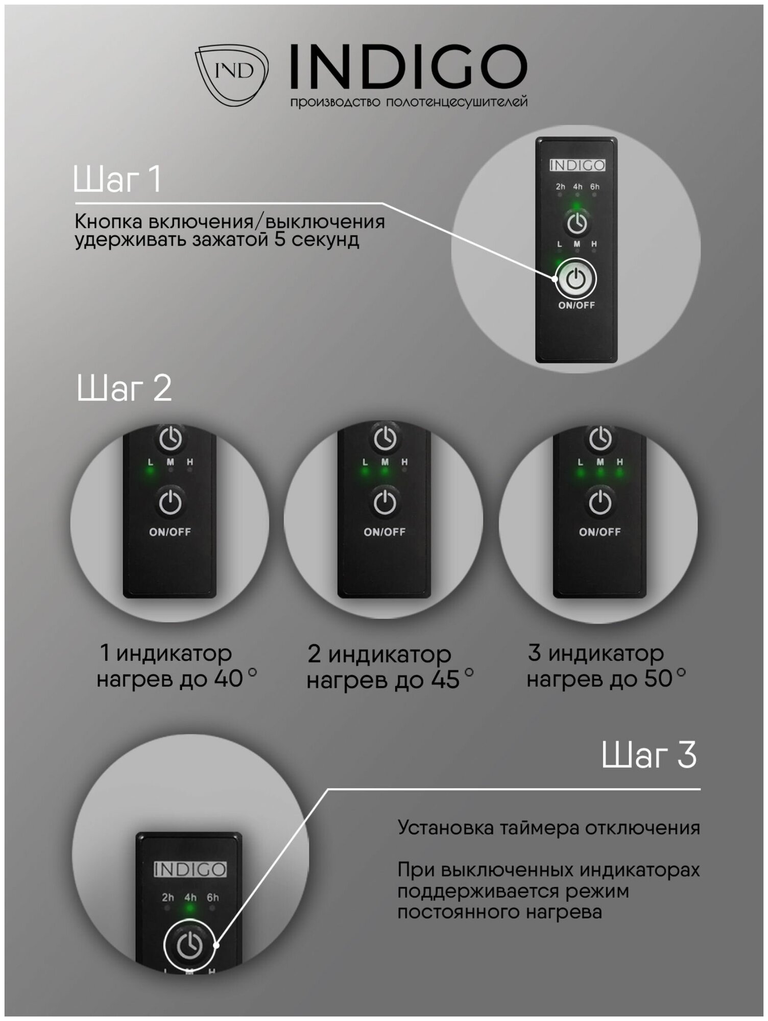 Полотенцесушитель электрический INDIGO Roof Lux в размере 800х500 (ВхШ) выбирают за его технологичность и универсальность. Модель оснащена терморегулятором нагрева, у которого три режима: 40, 45, 50 градусов и таймером на отключение через 2, 4, 6 часов. Универсальность изделия предусматривает подключение через прямой провод, который переставляется на нужную вам сторону или скрытое подключение без покупки дополнительного переходника. Длина провода 1,2 метра. Изделие окрашено порошковой краской по специальной технологии. Полотенцесушитель относится к энергоэффективным изделиям, потребляемая мощность в данном размере 80 Вт. Специальная технология нагревательного кабеля защищает полотенцесушитель от перегрева что влияет на длительные сроки службы. В комплектации идут 4 телескопических держателя, комплект для монтажа и гарантийный паспорт. Полотенцесушитель INDIGO Roof Lux застрахован и имеет гарантию 3 года. Выбирая INDIGO вы получаете надежный продукт из нержавеющей стали с гарантией качества от Российского производителя.