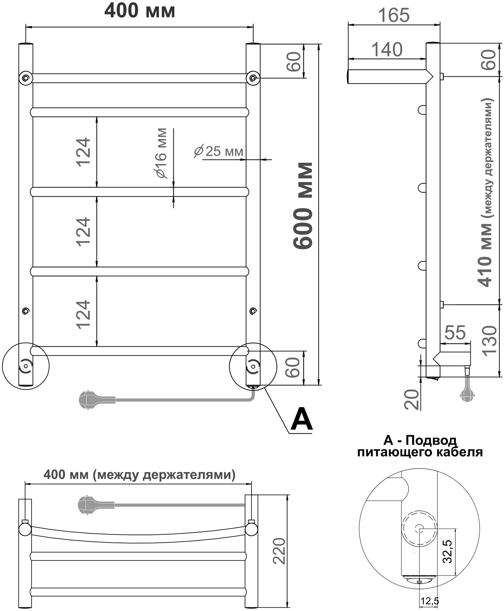 Полотенцесушитель электрический INDIGO Arc с полкой в размере 600х400 (ВхШ) выбирают за его классический вид – лесенки и универсальность. Модель оснащена кнопкой включения на нижней части стойки. Универсальность изделия предусматривает подключение через прямой провод, который переставляется на нужную вам сторону или скрытое подключение без покупки дополнительного переходника. Длина прямого провода 1,2 метра. Изделие имеет полку для большего удобства и комфорта. Полотенцесушитель Arc относится к энергоэффективным изделиям, потребляемая мощность в данном размере 55 Вт. Специальная технология нагревательного кабеля защищает полотенцесушитель от перегрева что влияет на длительные сроки службы. В комплектации идут 4 телескопических держателя, комплект для монтажа и гарантийный паспорт. Полотенцесушитель INDIGO Arc с полкой застрахован и имеет гарантию 3 года. Выбирая INDIGO вы получаете надежный продукт из нержавеющей стали с гарантией качества от Российского производителя.