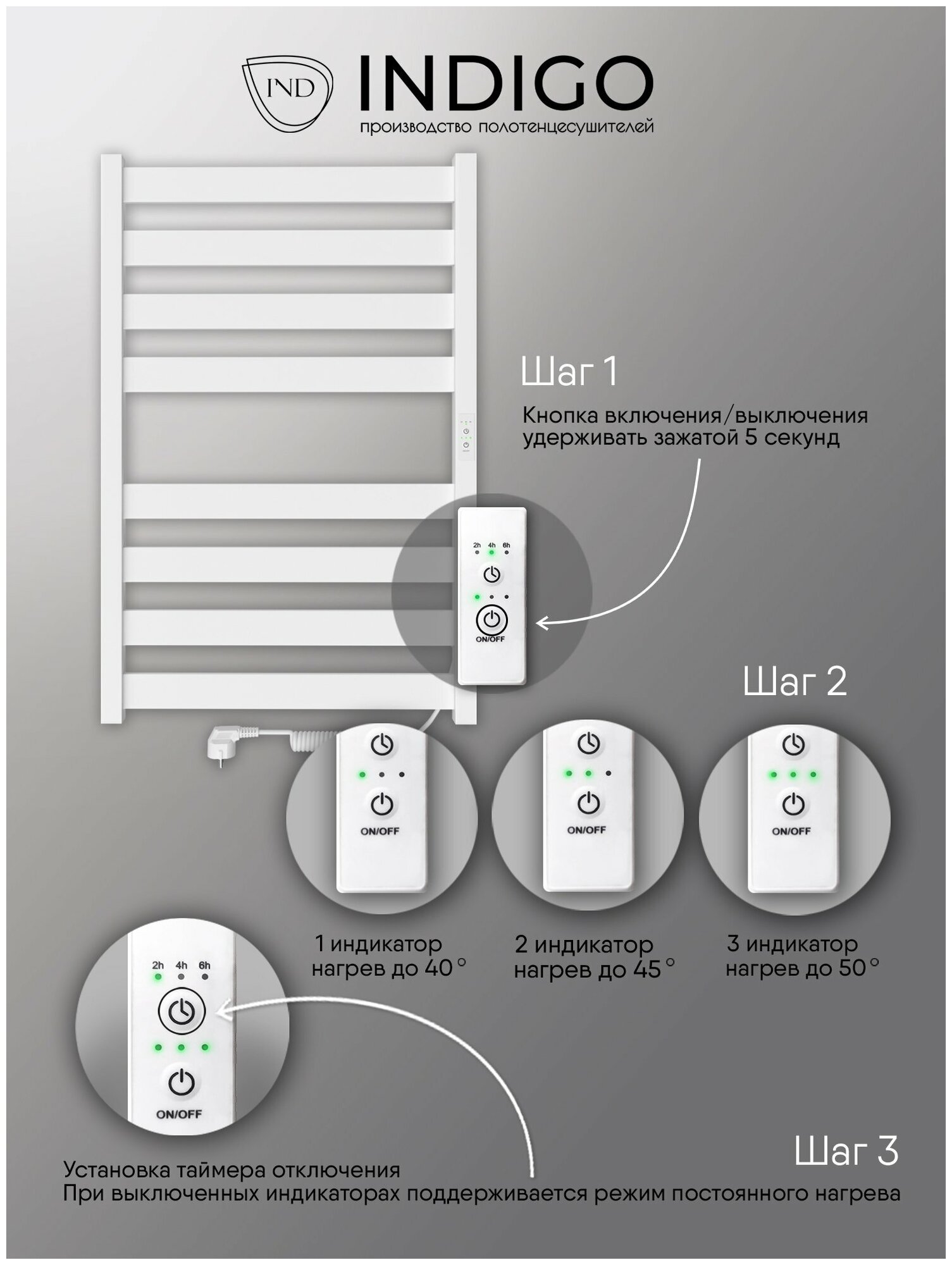 Полотенцесушитель электрический INDIGO Oktava Slim 5 в размере 800х400 (ВхШ) выбирают за его технологичность и универсальность. Модель имеет терморегулятор нагрева, у которого три режима: 40, 45, 50 градусов и таймер на отключение через 2, 4, 6 часов. Универсальность изделия предусматривает подключение через провод, который переставляется на нужную вам сторону или скрытое подключение без покупки дополнительного переходника. Длина провода 1,2 метра. Изделие окрашено порошковой краской по специальной технологии. Полотенцесушитель относится к энергоэффективным изделиям, потребляемая мощность в данном размере 85 Вт. Специальная технология нагревательного кабеля защищает полотенцесушитель от перегрева что влияет на длительные сроки службы. В комплектации идут 4 телескопических держателя, комплект монтажа и гарантийный паспорт. Полотенцесушитель INDIGO Oktava Slim 5 застрахован и имеет гарантию 3 года. Выбирая INDIGO вы получаете надежный продукт из нержавеющей стали с гарантией качества от Российского производителя