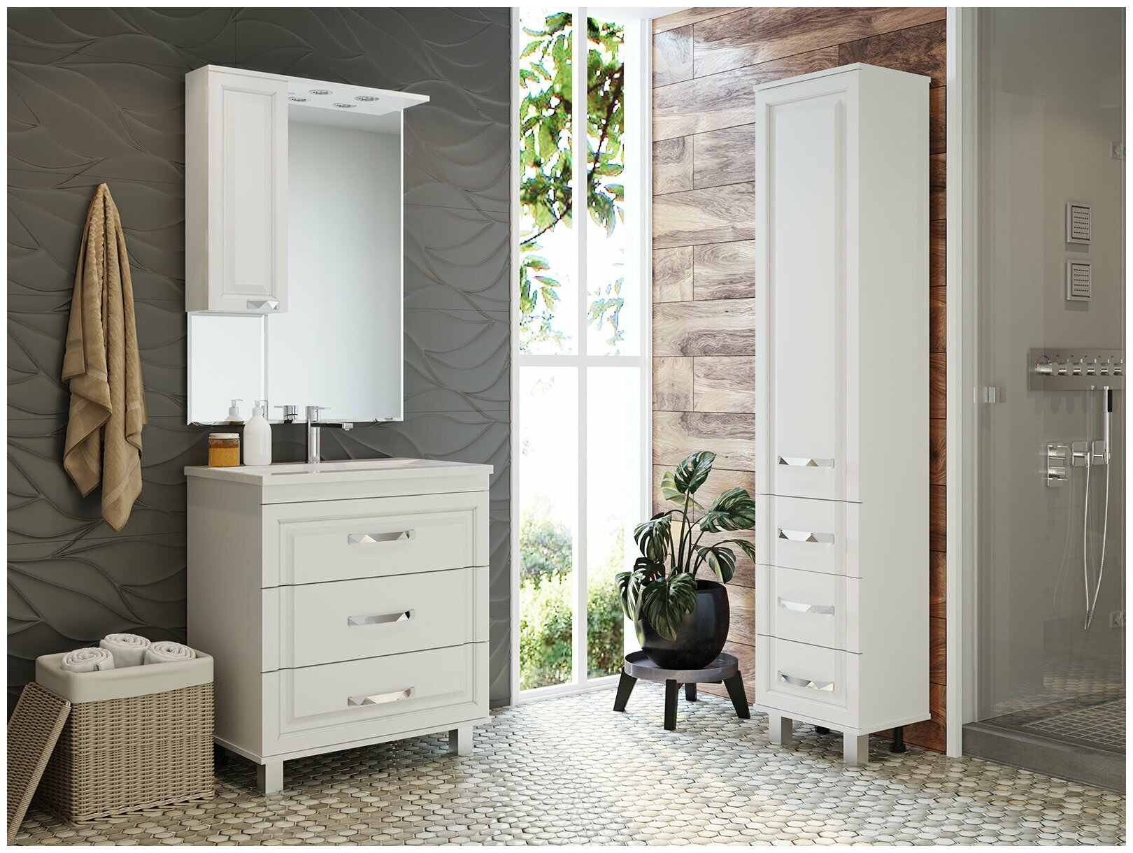 Комплект мебели Терра представляет собой сочетание напольной тумбы под раковину и подвесного зеркального шкафа. Напольная тумба имеет три выдвижных ящика по центру и два боковых отделения с распашными фасадами. Навесной шкаф имеет большое зеркальное полотно, по бокам которого расположены два отделения для хранения различных ванных принадлежностей, закрытых распашными фасадами. Зеркало оснащено яркой подсветкой и розеткой с выключателем внутри шкафчика.Благодаря наличию общих симметричных элементов, тумба и зеркальный шкаф смотрятся вместе монолитно и стильно. Материал фасадов мебели – МДФ с эмалевым покрытием, а петли дверей и направляющие ящиков оснащены доводчиками. Мебель из коллекции Терра станет отличным решением для просторной ванной комнаты в классическом или современном нейтральном стиле.