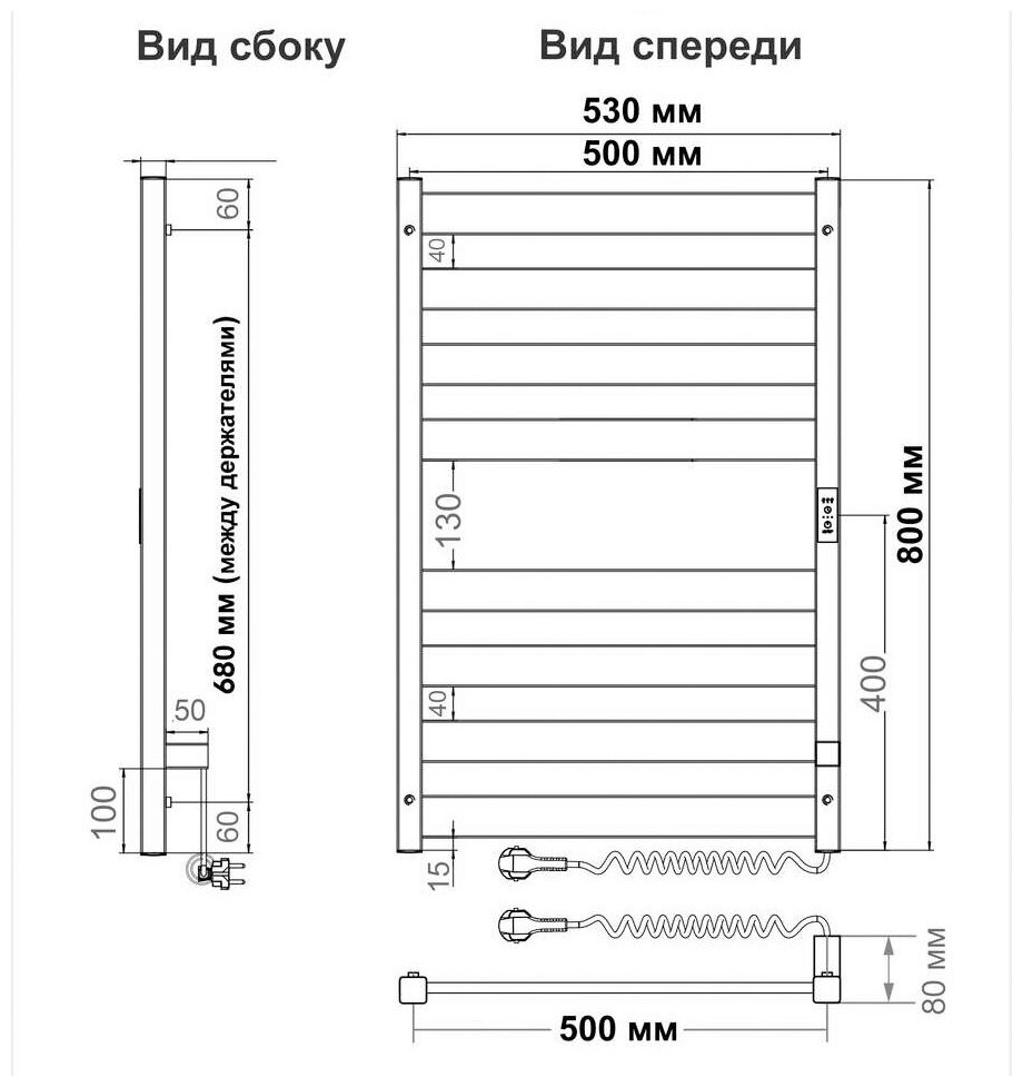 | ВКоробке | Полотенцесушитель - 1 шт. Терморегулятор - 1 шт. Комплект креплений - 1 шт. Комплект декоративных заглушек - 1 шт. Электрический кабель - 1 шт. Инструкция - 1 шт. |