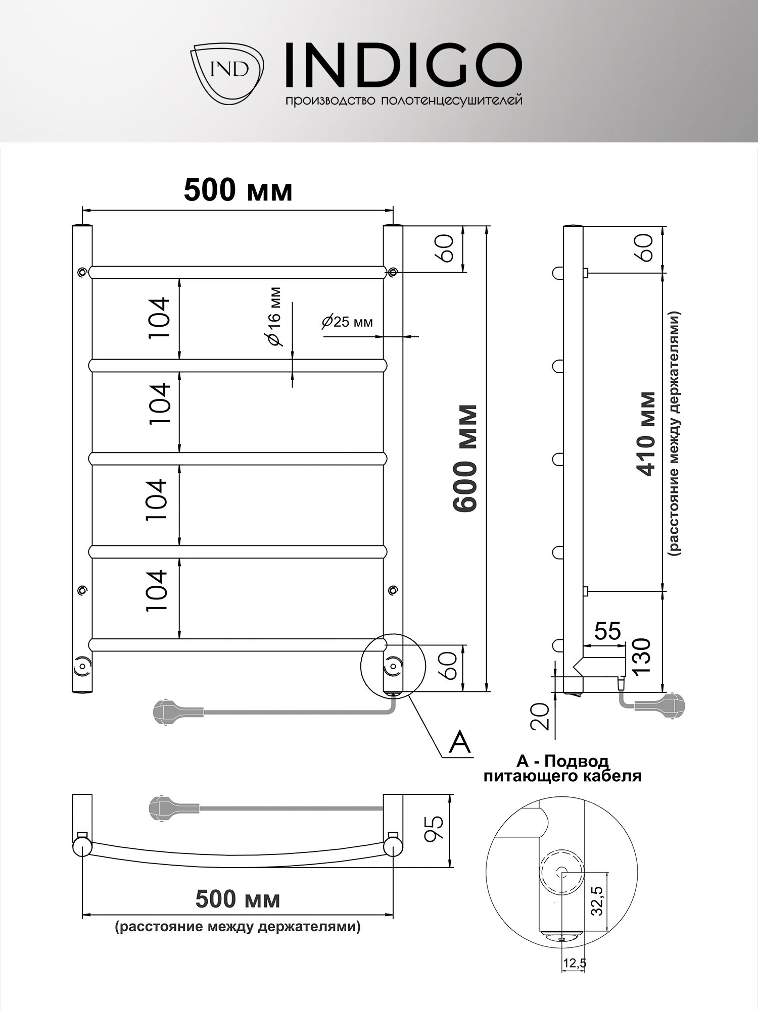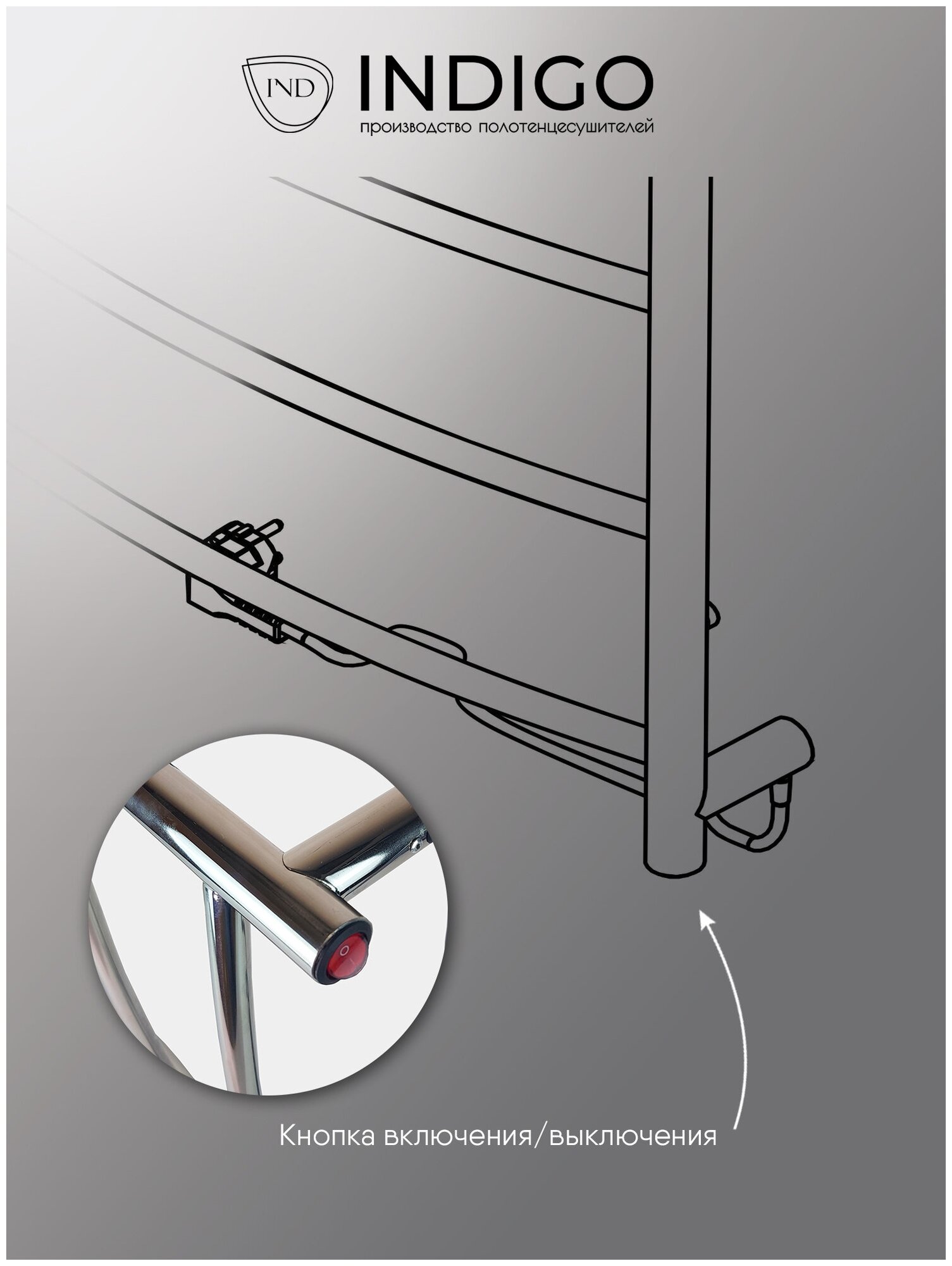 Полотенцесушитель электрический INDIGO Arc в размере 600х500 (ВхШ) выбирают за его классический вид – лесенки и универсальность. Модель оснащена кнопкой включения на нижней части стойки. Универсальность изделия предусматривает подключение через прямой провод, который переставляется на нужную вам сторону или скрытое подключение без покупки дополнительного переходника. Длина прямого провода 1,2 метра. Полотенцесушитель Arc относится к энергоэффективным изделиям, потребляемая мощность в данном размере 65 Вт. Специальная технология нагревательного кабеля защищает полотенцесушитель от перегрева что влияет на длительные сроки службы. В комплектации идут 4 телескопических держателя, комплект для монтажа и гарантийный паспорт. Полотенцесушитель INDIGO Arc застрахован и имеет гарантию 3 года. Выбирая INDIGO вы получаете надежный продукт из нержавеющей стали с гарантией качества от Российского производителя.