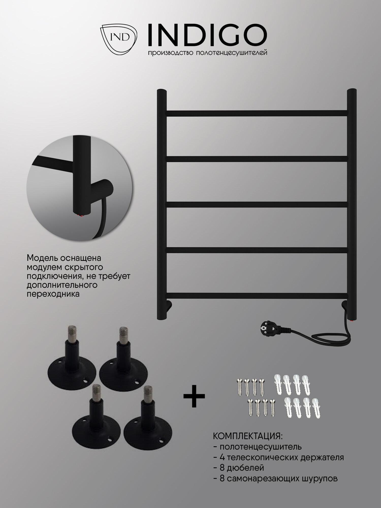 Полотенцесушитель электрический INDIGO Line в размере 600х500 (ВхШ) выбирают за его классический вид – лесенки и универсальность. Модель оснащена кнопкой включения на нижней части стойки. Универсальность изделия предусматривает подключение через прямой провод, который переставляется на нужную вам сторону или скрытое подключение без покупки дополнительного переходника. Длина прямого провода 1,2 метра. Изделие окрашено порошковой краской по специальной технологии. Полотенцесушитель Line относится к энергоэффективным изделиям, потребляемая мощность в данном размере 65 Вт. Специальная технология нагревательного кабеля защищает полотенцесушитель от перегрева что влияет на длительные сроки службы. В комплектации идут 4 телескопических держателя, комплект для монтажа и гарантийный паспорт. Полотенцесушитель INDIGO Line застрахован и имеет гарантию 3 года. Выбирая INDIGO вы получаете надежный продукт из нержавеющей стали с гарантией качества от Российского производителя.