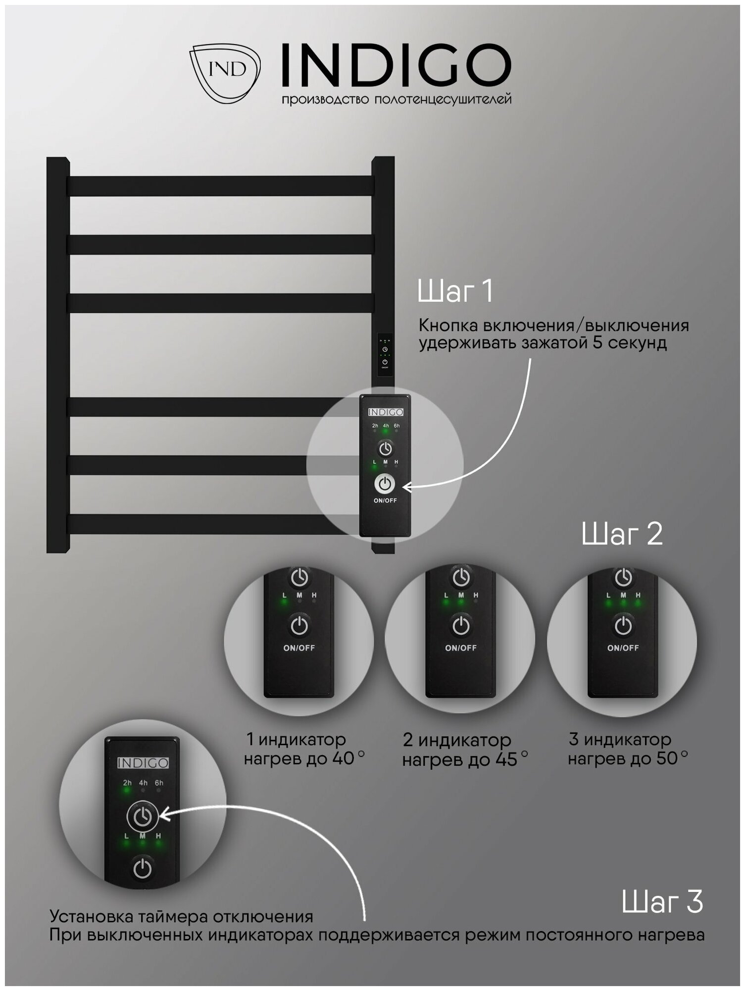 Полотенцесушитель электрический INDIGO Oktava Slim 3 в размере 600х500 (ВхШ) выбирают за его технологичность и универсальность. Модель имеет терморегулятор нагрева, у которого три режима: 40, 45, 50 градусов и таймер на отключение через 2, 4, 6 часов.Универсальность изделия предусматривает подключение через провод, который переставляется на нужную вам сторону или скрытое подключение без покупки дополнительного переходника. Длина провода 1,2 метра. Изделие окрашено порошковой краской по специальной технологии. Полотенцесушитель относится к энергоэффективным изделиям, потребляемая мощность в данном размере 70 Вт. Специальная технология нагревательного кабеля защищает полотенцесушитель от перегрева что влияет на длительные сроки службы. В комплектации идут 4 телескопических держателя, комплект монтажа и гарантийный паспорт. Полотенцесушитель INDIGO Oktava Slim 3 застрахован и имеет гарантию 3 года. Выбирая INDIGO вы получаете надежный продукт из нержавеющей стали с гарантией качества от Российского производителя