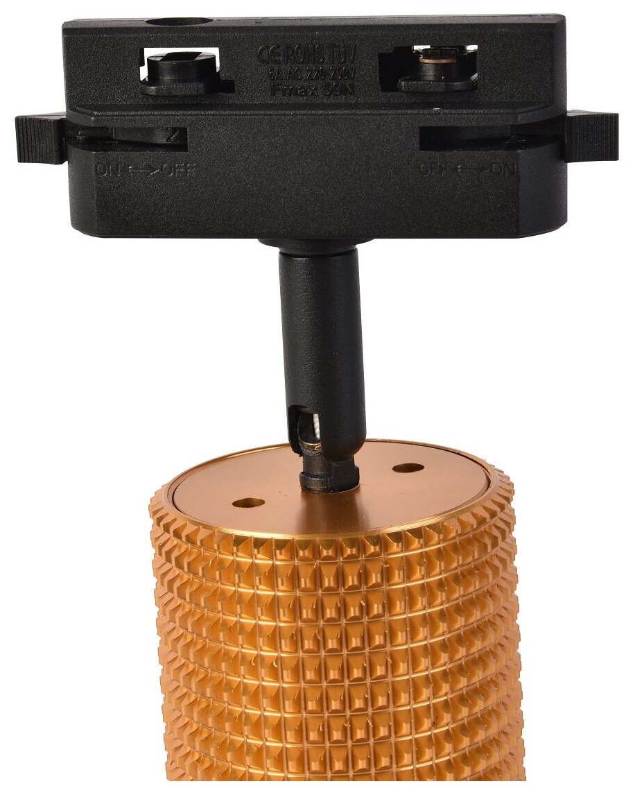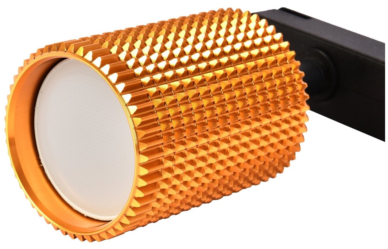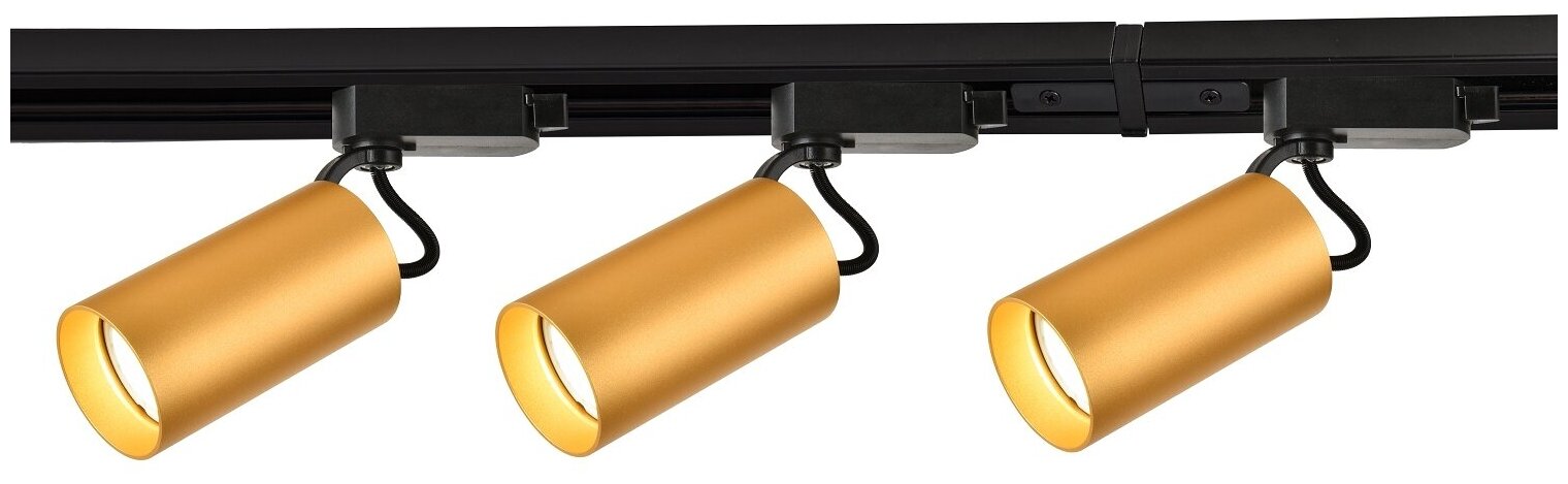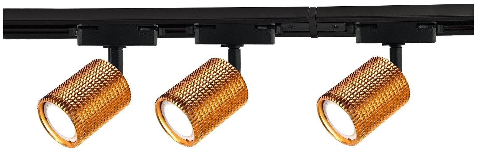 каркас цвета золота, в комплект трековой системы входят: 3 спота, шинопровод (2х1м) и коннектор, угол поворота до 75°, лампу GU10 можно менять