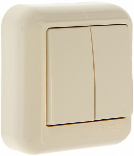 Выключатель Прима двухклавишный от Schneider Electric накладной, цвет слоновая кость, в сборе. Предназначен для сетей до 250 В на ток до 6 А. Кнопки и рамка изготовлены из качественного ABS-пластика, устойчивого к царапинам и УФ-излучению, а серебряные контакты обеспечивают высокую надежность (пригодность для люминесцентных светильников). Выключатель Прима прост в установке, прочен, имеет надёжный и неприхотливый механизм. Поставляется в комплекте с рамкой того же цвета. Сделано в России.
