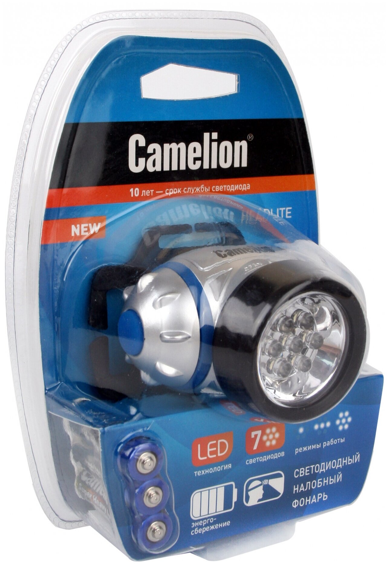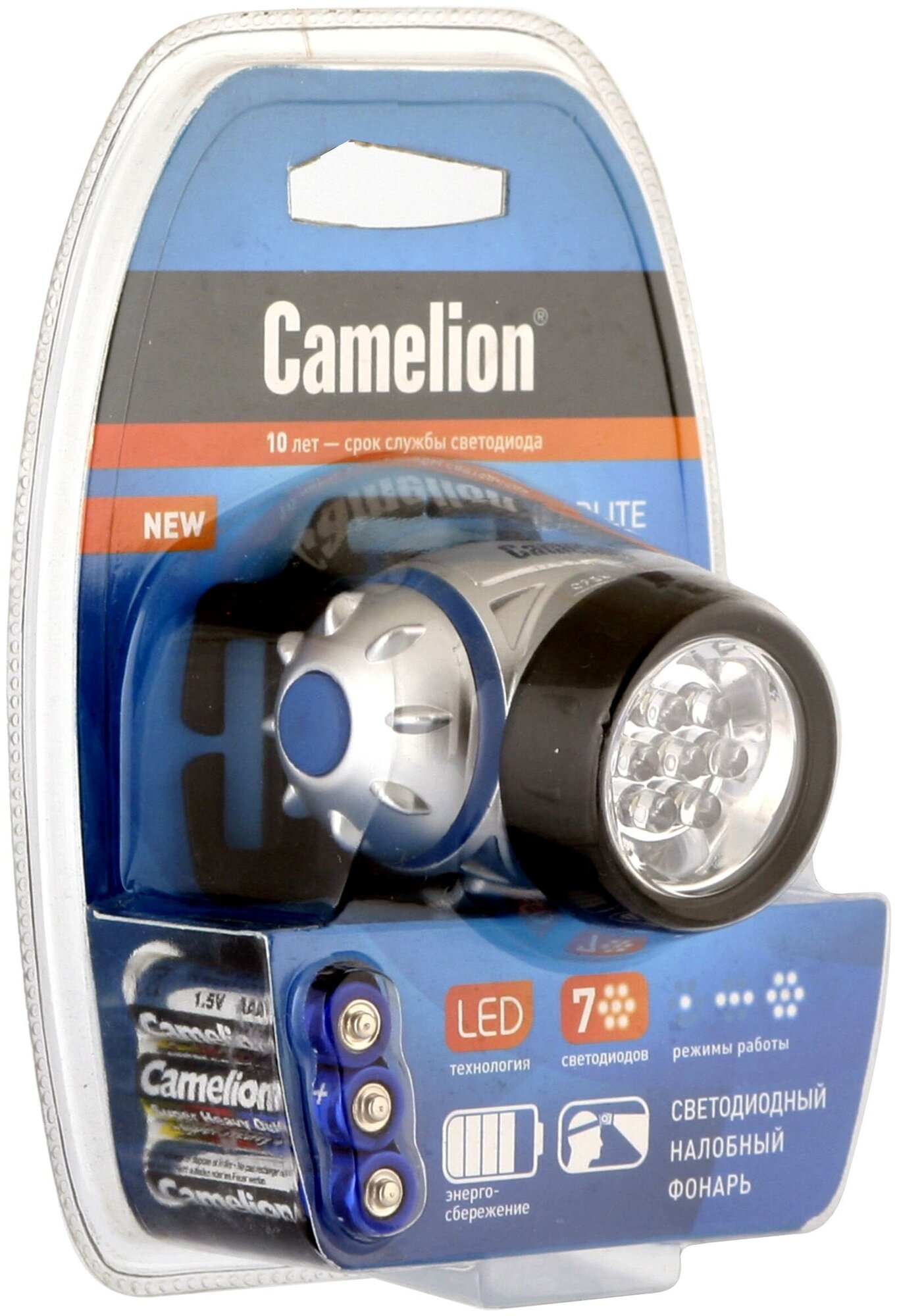 Фонарь CAMELION налобн металлик 7led 3 реж 3xr03 в компл пласт блист