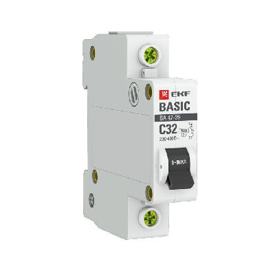 **Автоматический выключатель EKF ВА47-29 1P С32 А** применяется для установки в жилых, административных, промышленных сооружениях. Обеспечивает проведение тока в нормальном режиме, оперативное управление участков электросетей. Защищает систему от перегрузок и короткого замыкания. Может использоваться как основной элемент системы конечного распределения.