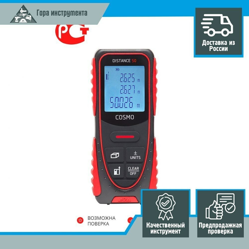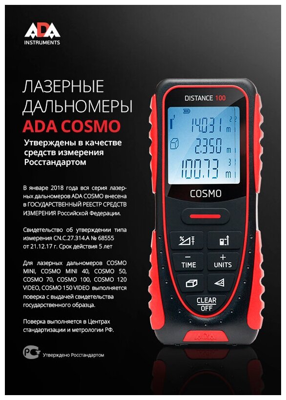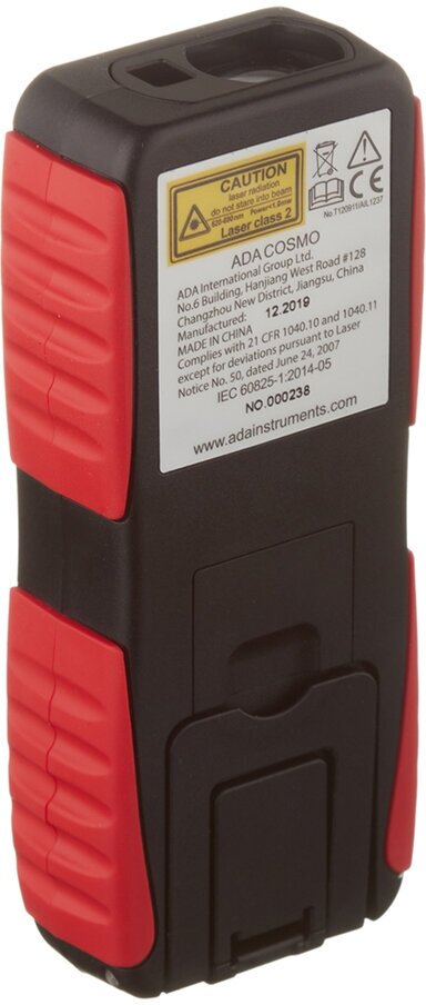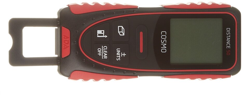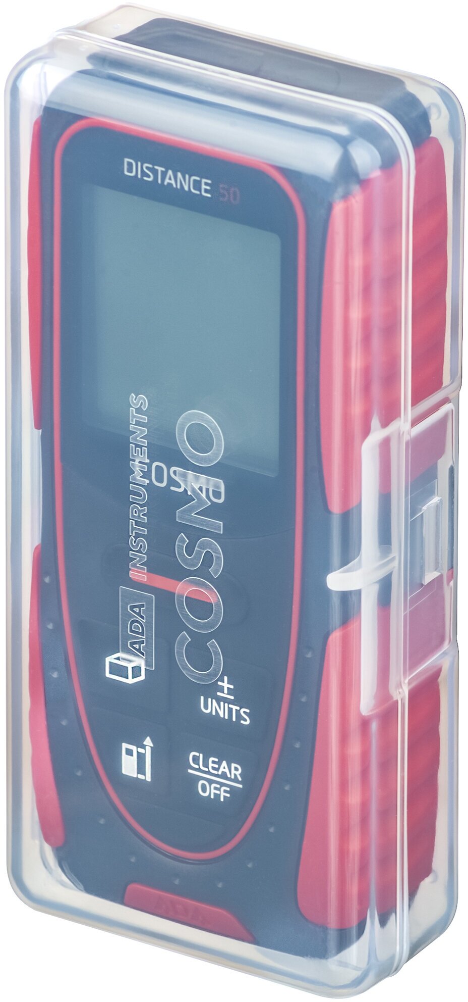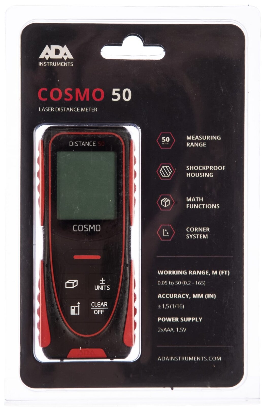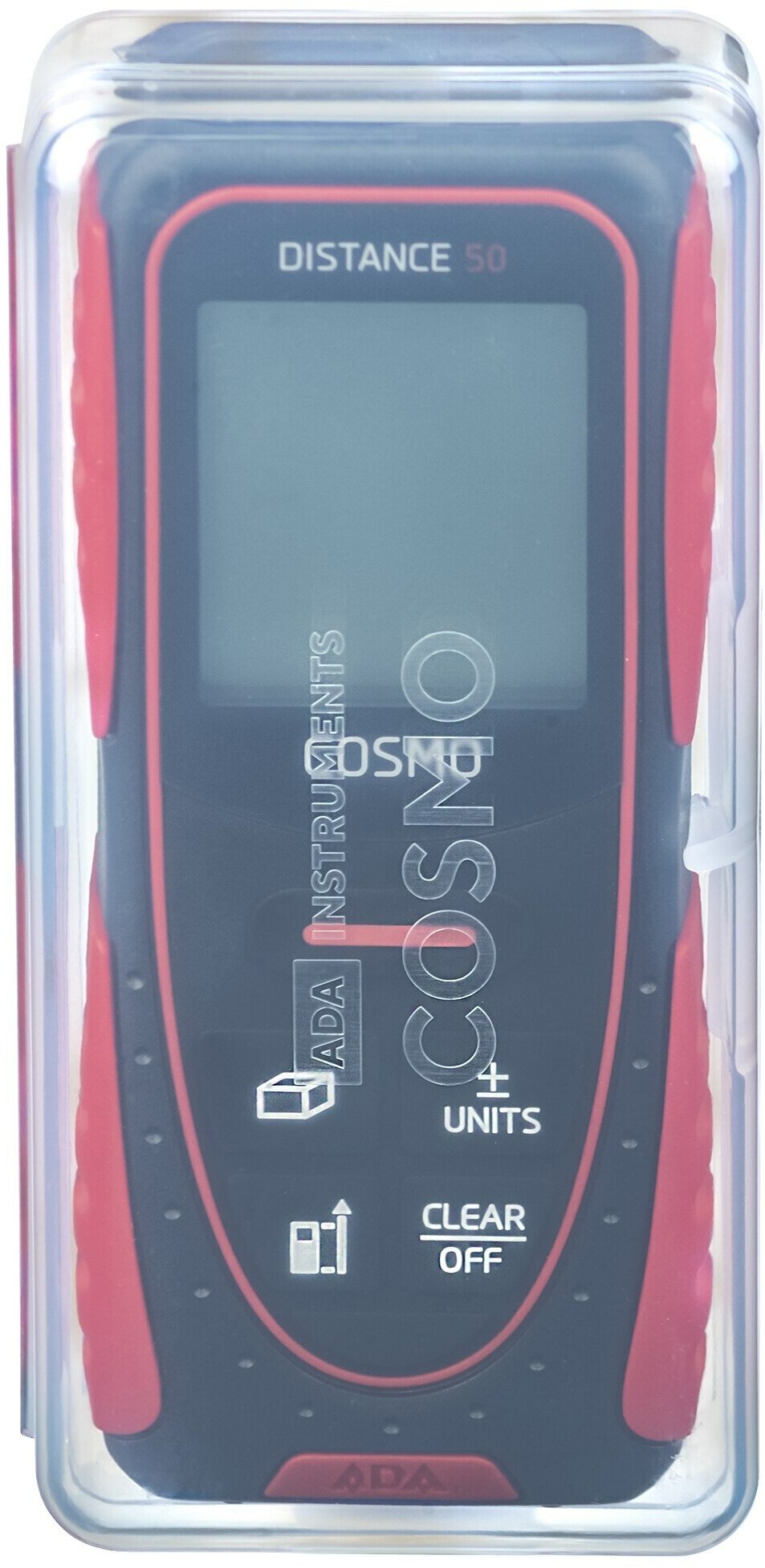 | Прочие особенности | Лазерная рулетка ADA COSMO 50 — это профессиональный лазерный дальномер, особенностью которого является простота и удобство в использовании. Главное достоинство этого профессионального прибора — измерение расстояний при любых условиях освещенности. Даже при ярком солнце ADA COSMO 50 измеряет расстояние до 50 метров с высокой точностью. Максимальная погрешность измерения составляет всего 1,5 миллиметра., , Эргономичный дизайн корпуса для удобства измерений. Защитные протекторные накладки расположены в верхней и нижней части прибора. Дальномер удобно лежит в руке. При ударах они защитят корпус от повреждений. Мембранные кнопки управления не боятся пыли и влаги., , Дальномер ADA COSMO 50 выполняет быстрое сложение и вычитание, а так же производит автоматическое вычисление площади и объема. Для возможности расчета недоступных для прямого измерения отрезков модель оснащена функцией вычисления расстояния между двумя точками по геометрическим формулам Пифагора. Откидная скоба поможет произвести точные измерения из углов и щелей., , Яркий дисплей с постоянной подсветкой. Трехстрочный дисплей с постоянной подсветкой и четкие крупные символы позволяют работать даже в условиях плохой освещенности. Результаты на дисплеи видно под любым углом и при любом свете., , ADA COSMO 50 — это надежный, современный лазерный дальномер с высокой точностью измерения, который станет для специалиста незаменимым помощником. |