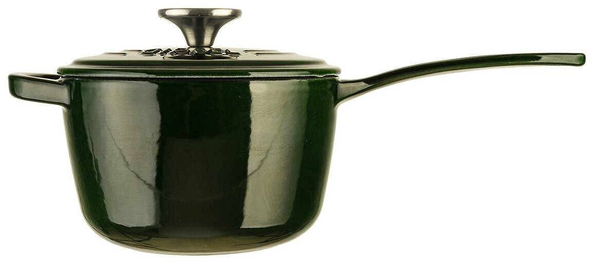 Ковш GIPFEL MAJOLICA 51089. Размер 17х11 см. Объем 1,7 л. Ковш сделан из чугуна с эмалированным покрытием. Крышка в комплекте. Ковш темно-зеленого цвета и сочетается с другой посудой серии MAJOLICA.