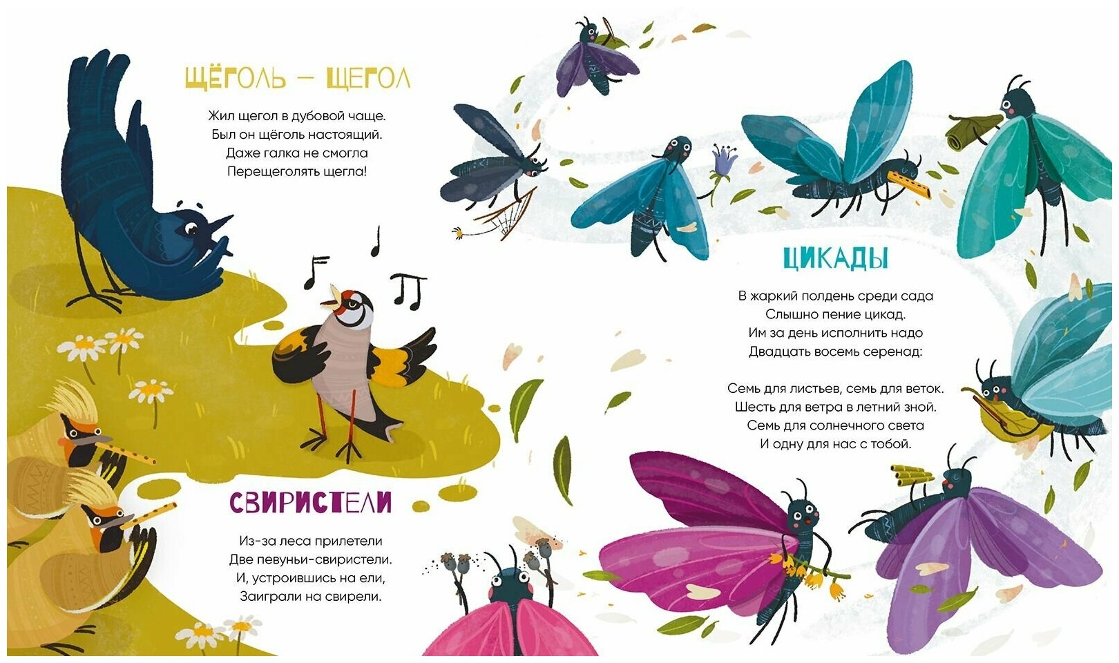 Сборник стихов, который можно читать вместе с ребенком, а можно дать ему для самостоятельного чтения: благодаря чёткому ритму и простым, понятным рифмам, стихи легко запоминаются и читаются. Каждое стихотворение — небольшая забавная история: о щегле, который был щёголем, ослике, мечтавшем о путешествии в Осло, любознательных мышках, городке фей. С помощью коротких и несложных сюжетов можно прививать привычку к чтению, развивать речь и тренировать память, а яркие иллюстрации на каждом развороте помогут развивать фантазию. В конце книги вы найдете веселые скороговорки — чтобы потренировать правильное звукопроизношение и не заскучать за таким важным занятием.