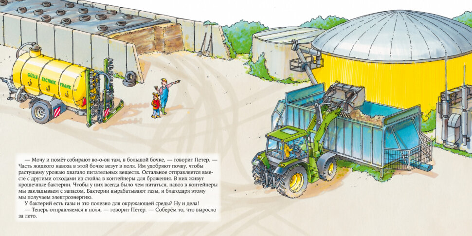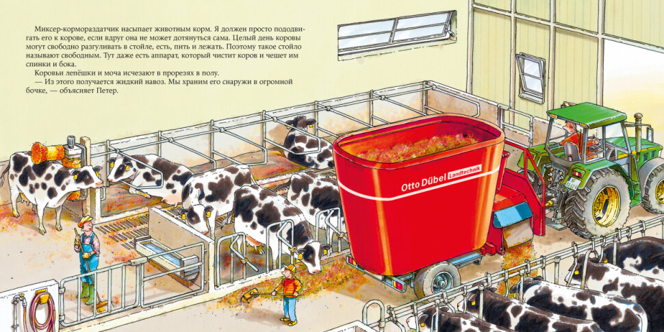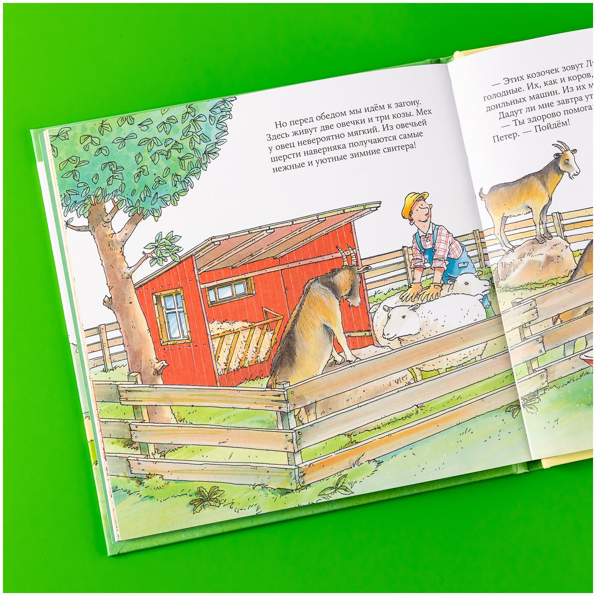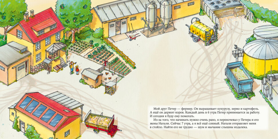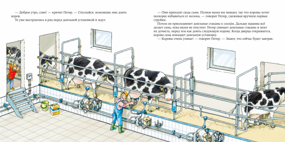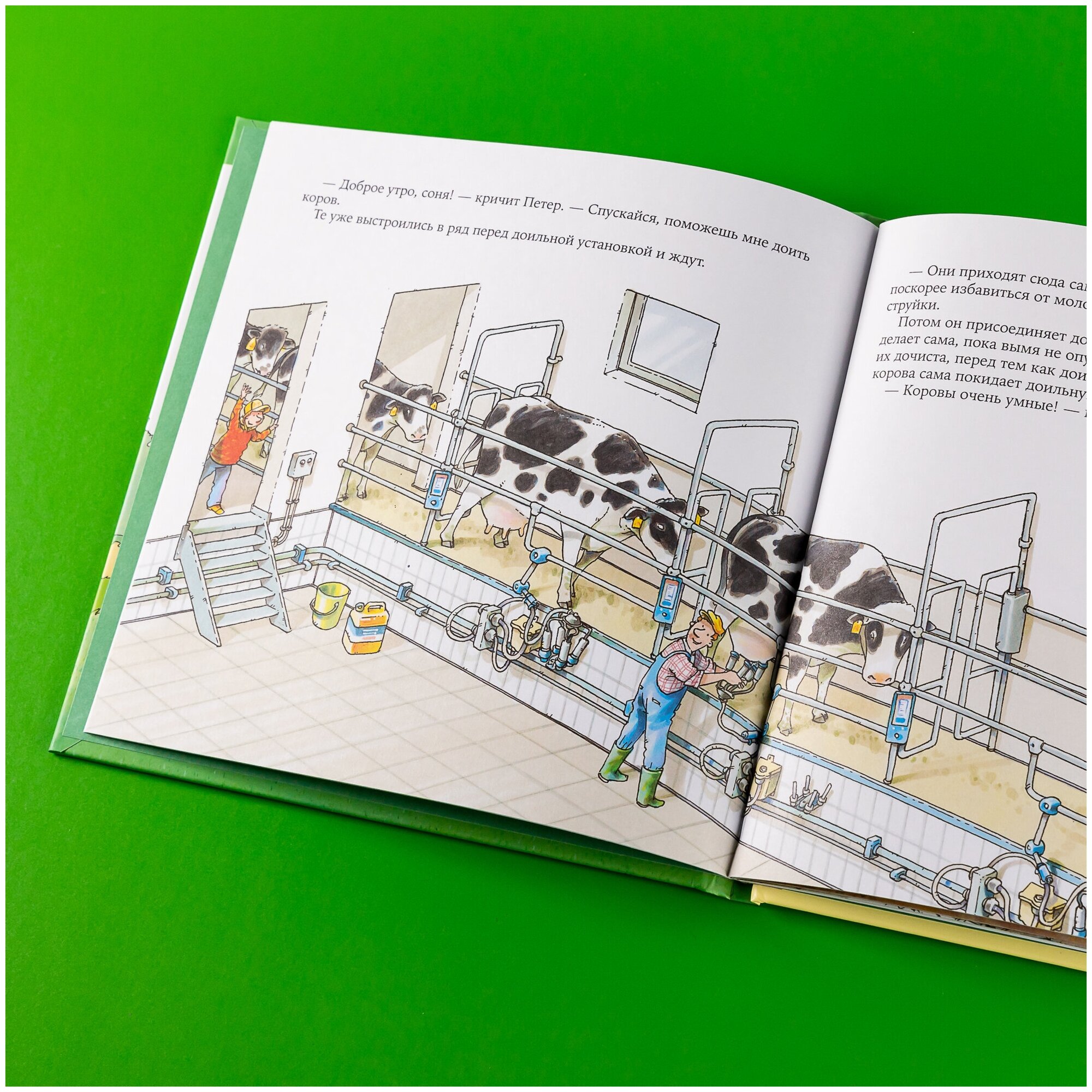 Все книги построены по принципу «один день из жизни...»: герои историй, дети, приходят в гости на работу к своим взрослым знакомым. В этой мальчик гостит на ферме и узнаёт много нового о буднях фермера: как доят коров и поддерживают чистоту в стойлах, как называется комбайн, который собирает урожай, для чего нужен культиватор и многое другое.