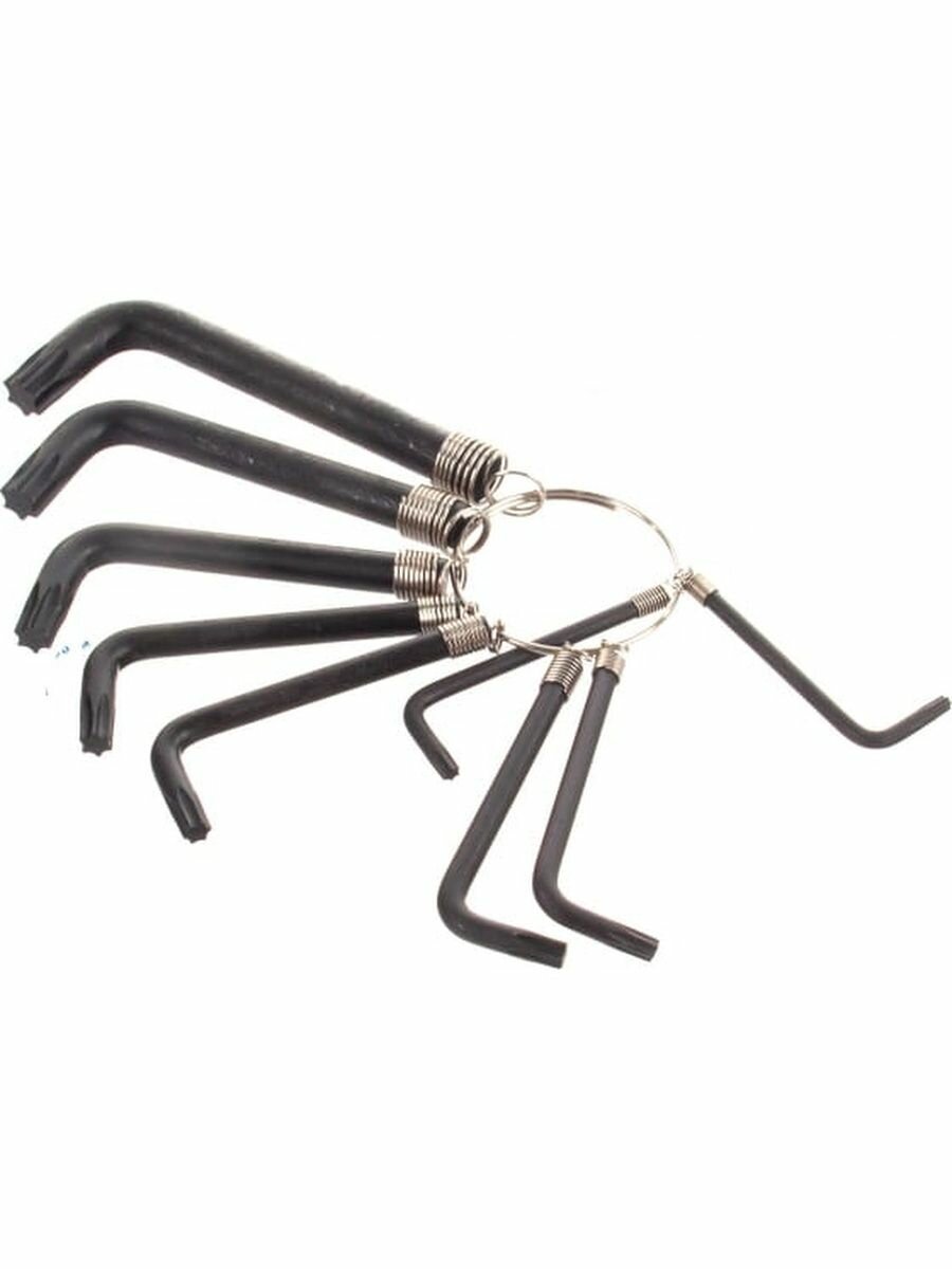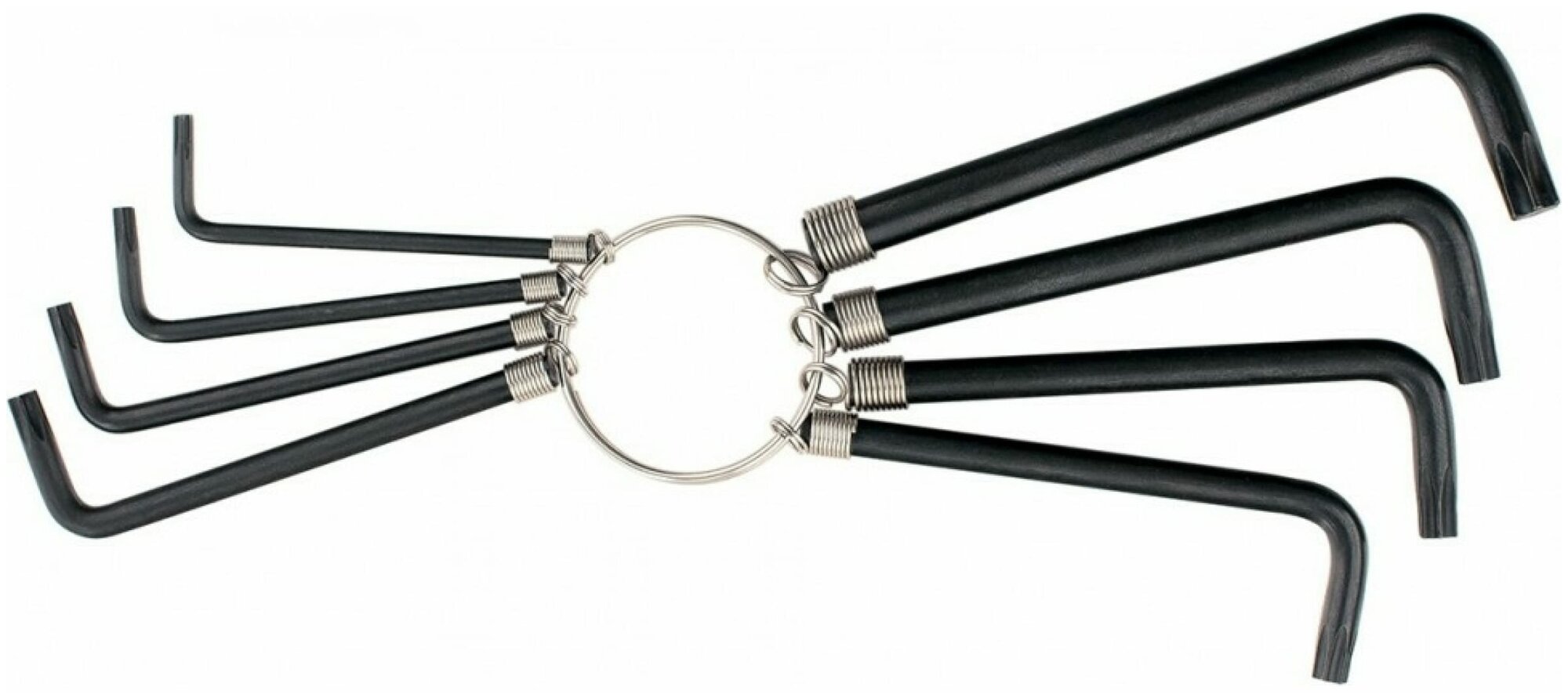 Набор имбусовых ключей c профилем Torx, предназначен для монтажа и демонтажа резьбовых соединений. Ключи изготовлены из углеродистой стали, оксидированы. Твердость рабочей части 45 HRС. Для удобства хранения ключи закреплены на кольце.