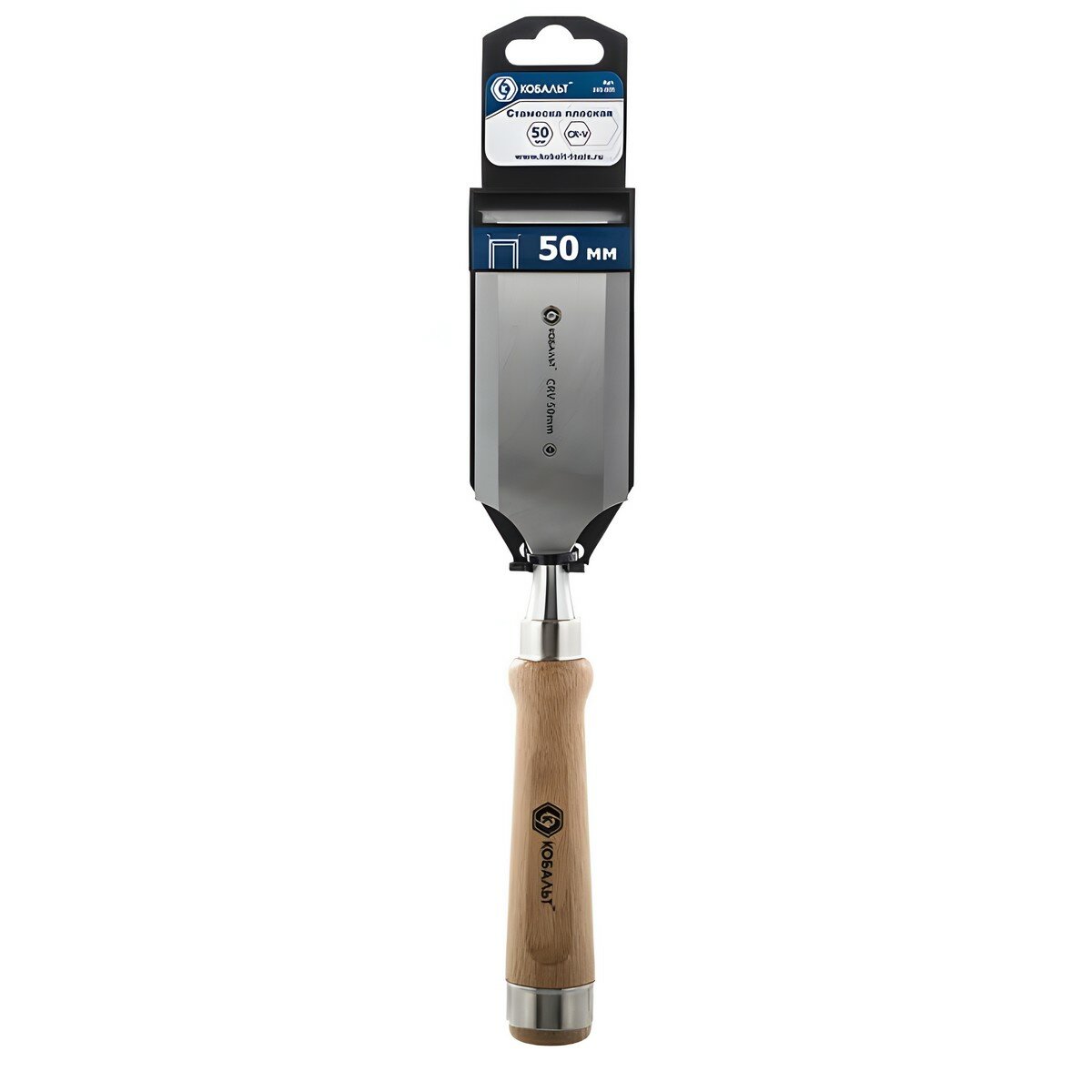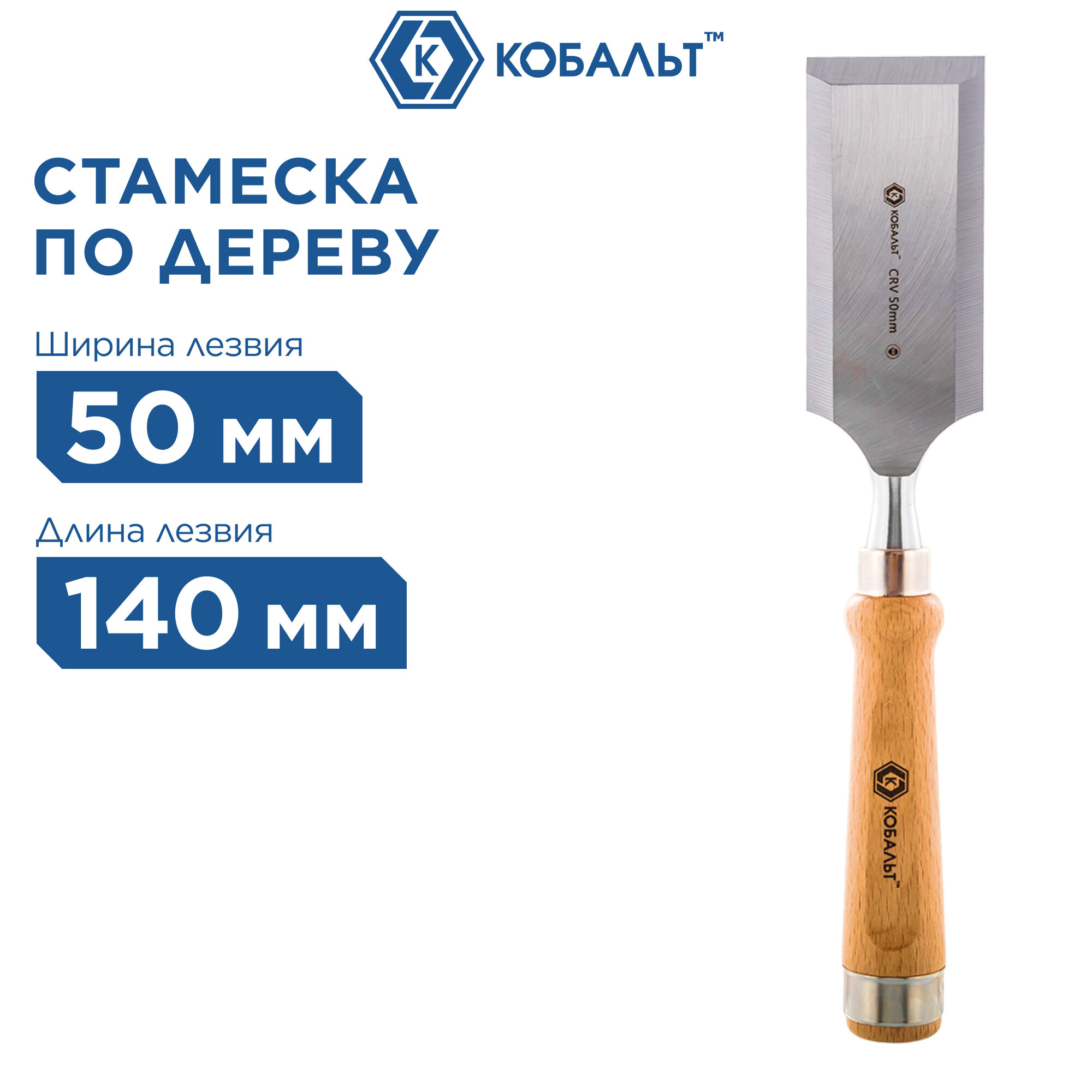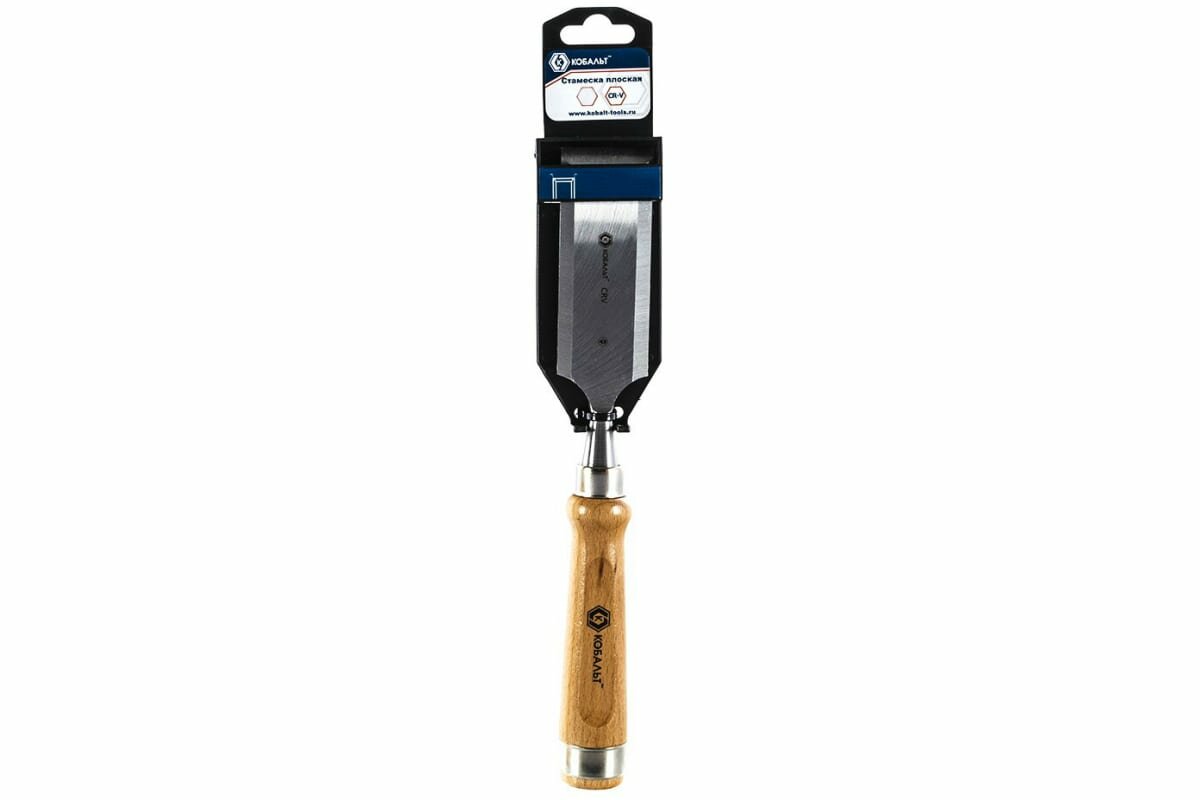 Плоская стамеска 50х140мм, CR-V, деревянная рукоятка кобальт предназначена для обработки мягкой древесины и древесины средней твердости, выборки пазов, при выполнении плотницких и столярных работ. Изготовлена из хром-ванадиевой стали 60 CrV с закалкой режущей части до 58-60 HRC. Деревянная рукоятка, обладая малой теплопроводностью, идеально подходит для работ в холодных условиях, существенно улучшает эргономику, уменьшает утомляемость руки и повышает комфортность работы. Порода древесины - бук. На рукоятке прочно установлено стальное кольцо для предотвращения растрескивания рукоятки при работе ударным инструментом. Работая стамеской не использовать металлический молоток, использовать деревянную киянку. Угол заточки 25° позволяет эффективно выполнять резание вдоль волокон и рубку поперек без опасности выкрашивания режущей кромки. Не использовать стамеску в качестве рычага. Для правки и грубой заточки использовать электрическое точило с обязательной подачей охлаждения для предотвращения отпуска стамески. Доводку микрофаски производить вручную с помощью мелкозернистого абразивного бруска - оселка.