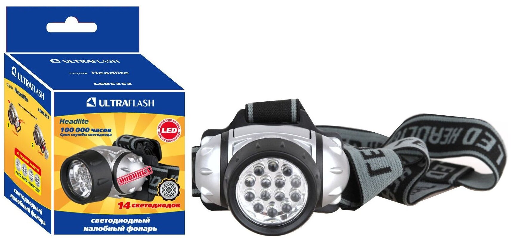 Фонарь Ultraflash электрический светодиодный налобный. Цвет корпуса: серебро + чёрный. Работает от 3 X AAA батареек (не входят в комплект). Материал корпуса - пластик. Источник света - 14 светодиодов с рассеивающими линзами с цветовой температурой 6500К со световым потоком 30 люмен. Дистанция освещения - до 20 метров. Четыре режима работы. Выключатель -четырёхпозиционный кнопочного типа. Время работы при использовании солевых батареек: 4 светодиода - до 33 часов, 8 светодиодов - до 22 часов, 14 светодиодов - до 18 часов, 18 светодиодов в мигающем режиме - до 80 часов. Комплектация: фонарь, эластичный ремешок для ношения на голове, поворотный отражатель, инструкция, упаковка. Степень пыле-влаго-защиты IP44. Упаковка - коробка. Максимальный линейный размер фонаря 6,8 см. Размер упаковки 5 см x 8 см x 10 см. Вес без упаковки 0,07 кг. Вес с упаковкой 0,10 кг.