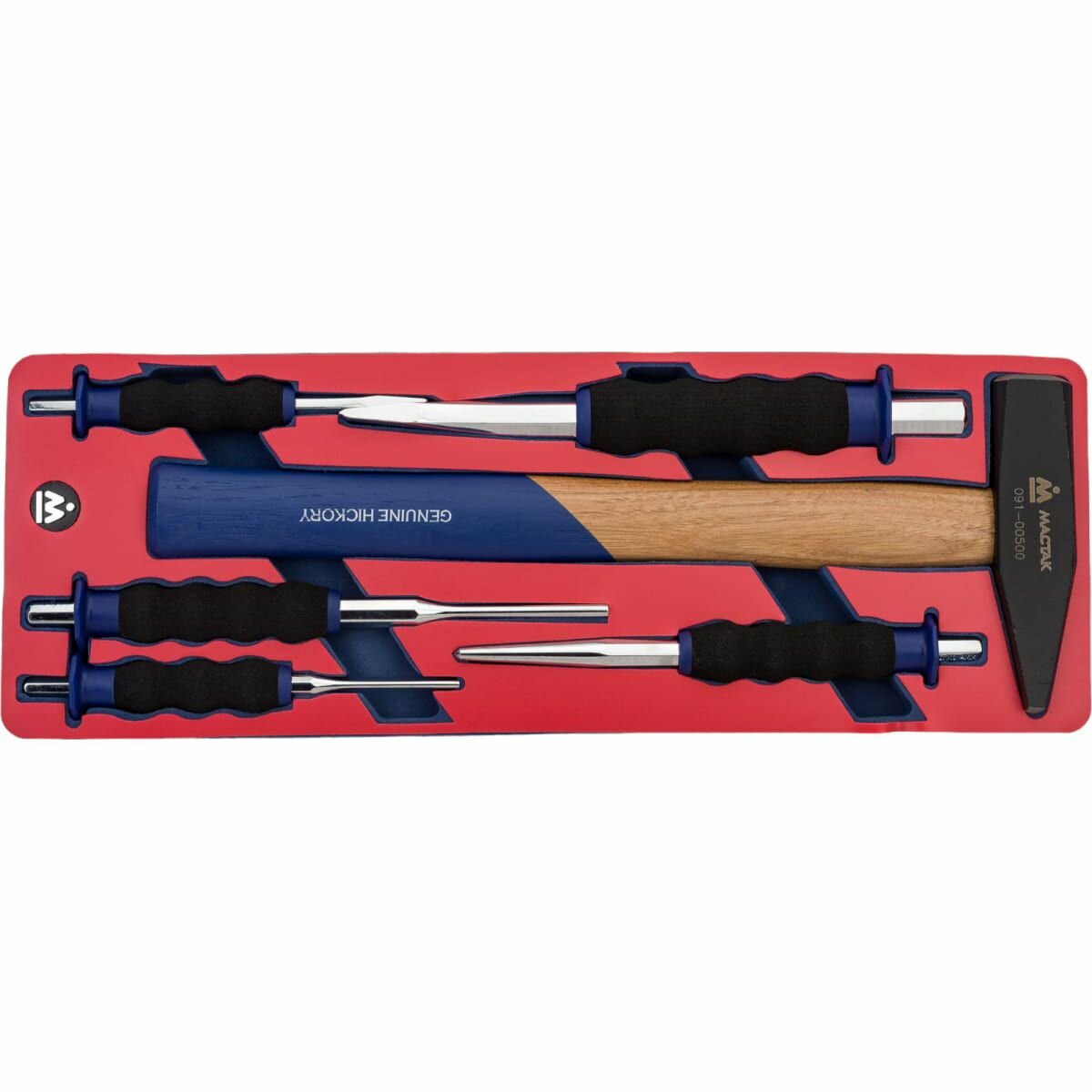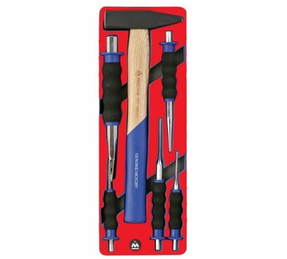 Набор инструментов 6 предметов молоток, зубила, выколотки, кернер Мастак в ложементе из материала EVA предназначен для комплектации передвижных инструментальных тележек или слесарных верстаков при создании индивидуальных рабочих мест на станциях технического обслуживания автомобилей и других предприятиях, занимающихся обслуживанием и ремонтом различной техники.Ручной слесарный инструмент:• Молоток с деревянной ручкой 500 г.• Зубила. Размеры: 10х140, 24х220 мм.• Выколотки. Размеры: 3х150, 5х200 мм.• Кернер 4х185 мм.