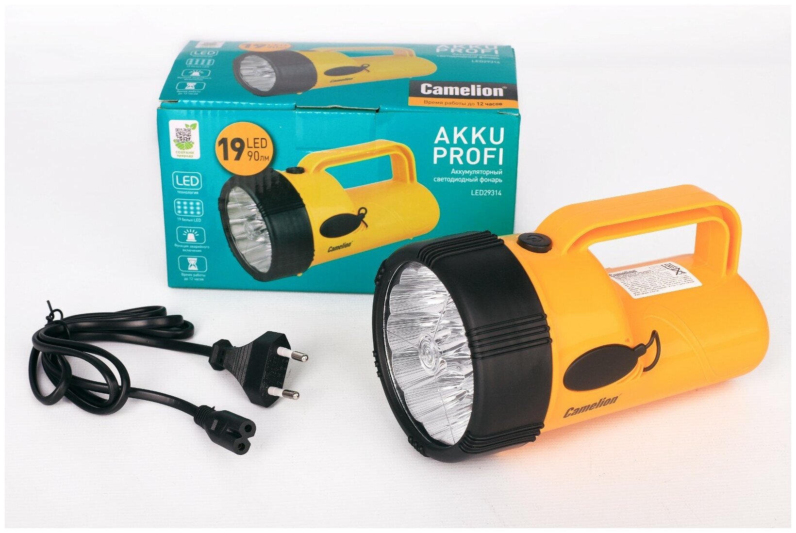 | Прочие особенности и свойства | Источник света - 19 светодиодов с цветовой темпаратурой 8200К. максимальным световым потоком 48 люмен,Дистанция освещения - до 30 метров,Выключатель - кнопочного типа,Время работы при полностью заряженном аккумуляторе:до 12 часов - яркость падает с разрядом аккумулятора,Время заряда - 16 часов,Режим аварийного включения при выключении сетевого электричества во время заряда |