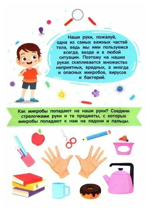 Энциклопедия \"Зачем мыть руки\" подойдёт для изучения детям уже с возраста детского сада. Ребёнок научится гигиене, узнает что такое вирусы, какие они бывают. Всё это на примере мальчика Кости, который мечтает стать врачом. На каждой странице энциклопедии интересные задания и головоломки для детей, которые касаются,гигиены. Для детей изучение книги будет интересной и познавательной.