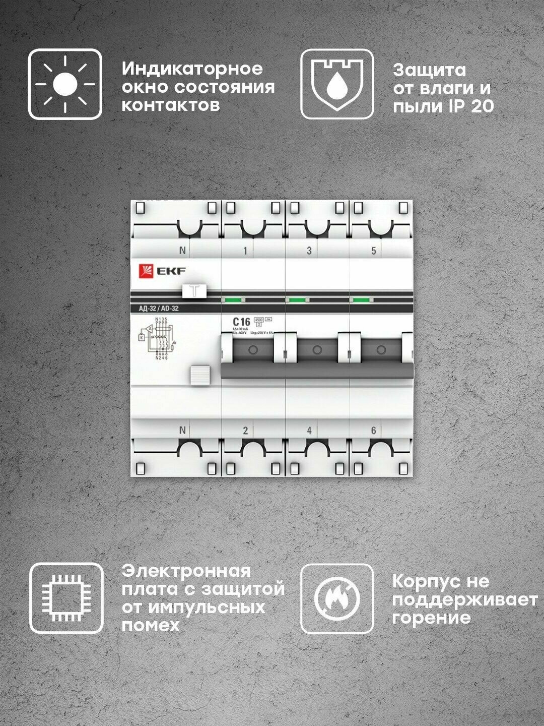 **Дифференциальный автомат EKF АД-12** совмещает функции автоматического выключателя и устройства защитного отключения. Устанавливается в распределительные щитки и работает в сети 230 В, Электромагнитный расцепитель разрывает цепь и обесточивает подключаемое оборудование, если через фазный провод протекает больший ток. Предупреждает перегрузку и утечку тока, предотвращает возгорания.