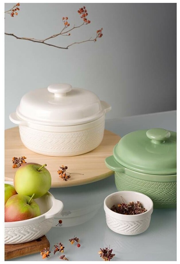 Посуду рекомендуется очищать от загрязнений в теплой воде с помощью мягкой губки с жидким средством. Допускается мытье в посудомоечной машине, использование в морозильной камере, микроволновке, духовке при температуре до 230°C.
