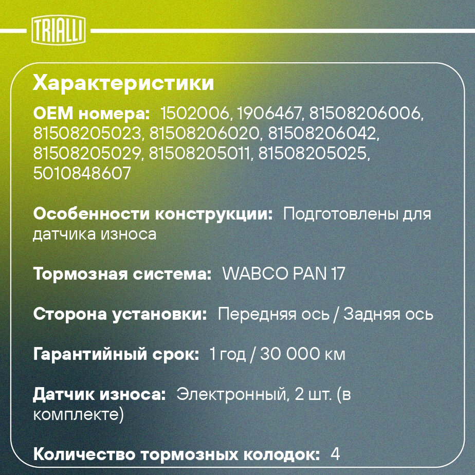 Сервис сравнения цен СкидкаГИД предлагает сравнить цены на товар «Колодки тормозные дисковые для автомобилей DAF MAN Iveco (WVA № 29088) с монтажным комплектом (в комплекте с 2-мя датчиками) TRIALLI (PFT 29088)»