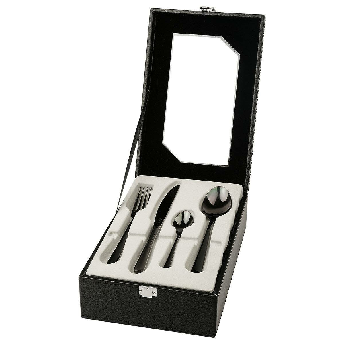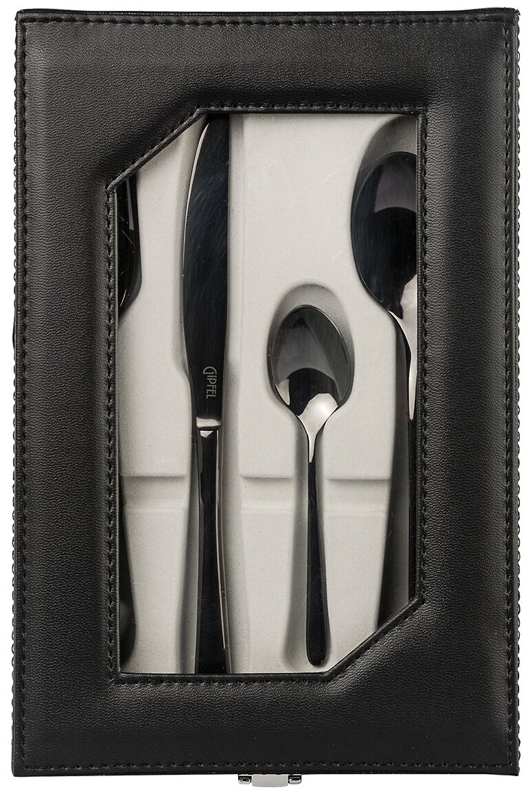 Набор столовых приборов GIPFEL MONTENEGRO 51236. В наборе 24 предмета на 6 персон. В состав набора входят 6 столовых ложек, 6 чайных ложек, 6 вилок и 6 столовых ножей. Предметы изготовлены из нержавеющей стали 18/10. Столовые приборы имеют благородный черный цвет и сатиновую полировку. Специальное PVD покрытие дополнительно защищает материал от коррозии и экологически безопасно. Приборы рекомендуется мыть вручную мягкими моющими средствами. Столовые приборы упакованы в подарочную черную коробку.