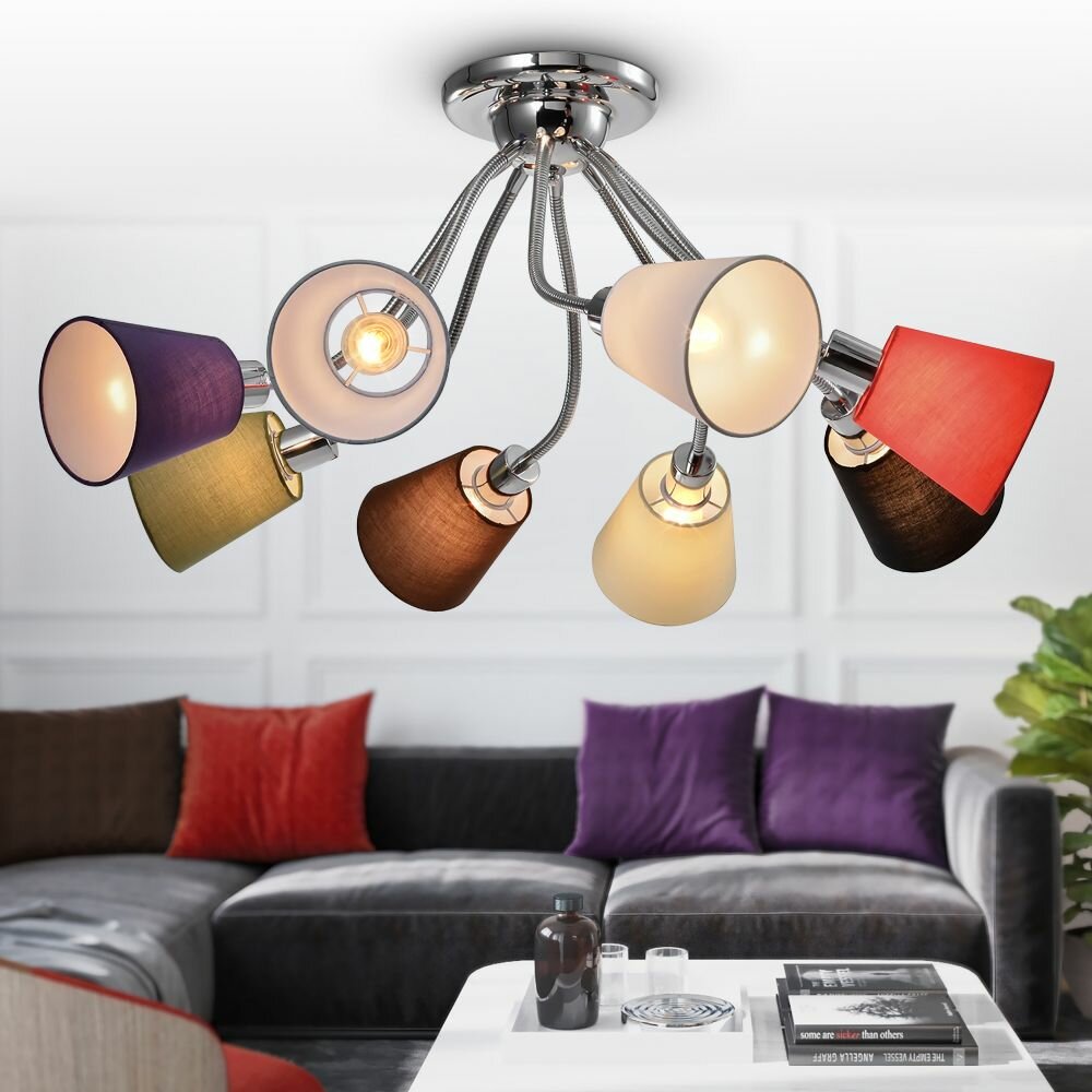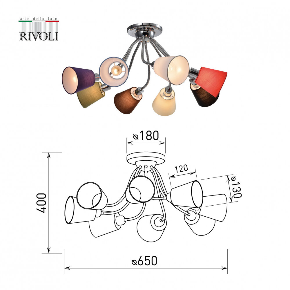 Rivoli Isolde (арт. 3122-308) - 8-рожковые люстры с разноцветными плафонами-абажурами и брутальной хромированной арматурой. Большие люстры в гостиную - удачный эксперимент итальянских дизайнеров по смешению стилей. Брутальная металлическая арматура с рожками-трубками держит креативные плафоны - классической формы, но разных цветов. Люстры Isolde отлично направляют свет вниз, распределяя его по всем сторонам комнаты. Освещаемая площадь этой большой люстры на потолок - до 24 м2. Люстры потолочные с разноцветными плафонами - хорошее решение для детской комнаты. Цвета плафонов: белый, серый, бежевый, светло-коричневый, коричневый, зеленый, фиолетовый, красный. Оттенки приглушены и эффектно сочетаются между собой. Такая люстра станет ярким стильным акцентом в комнате со сдержанным цветовым оформлением или хорошо впишется в эклектичный разноцветный интерьер. Дополняет коллекцию люстра на кухню с 5 разноцветными плафонами - арт. 3122-305. Абажурная ткань устойчива к загрязнению, пыли и выцветанию.