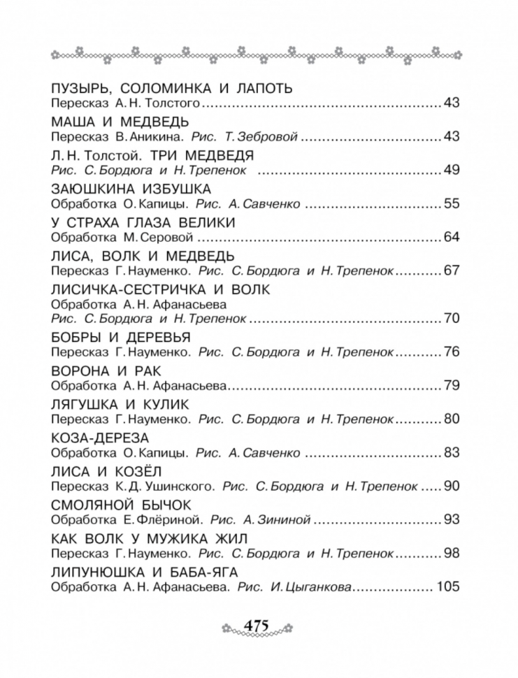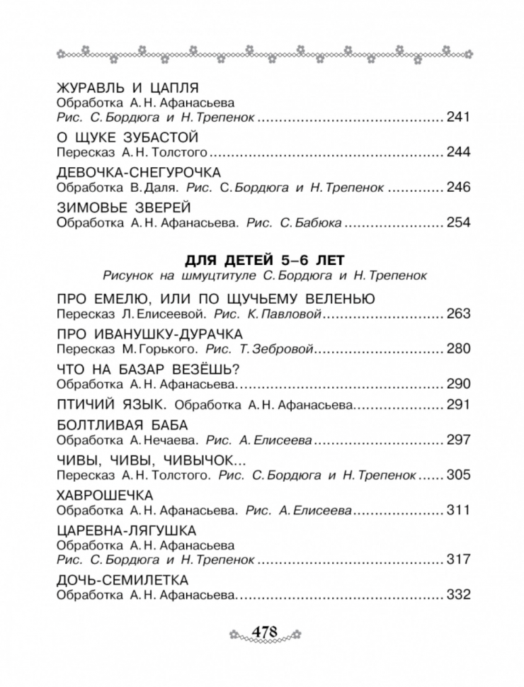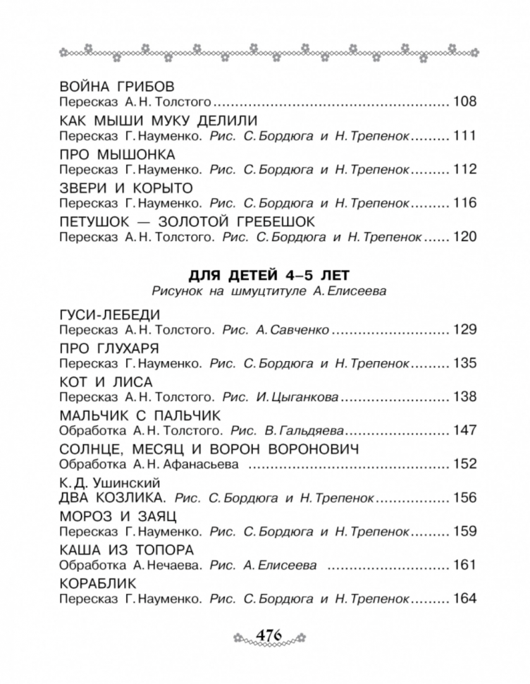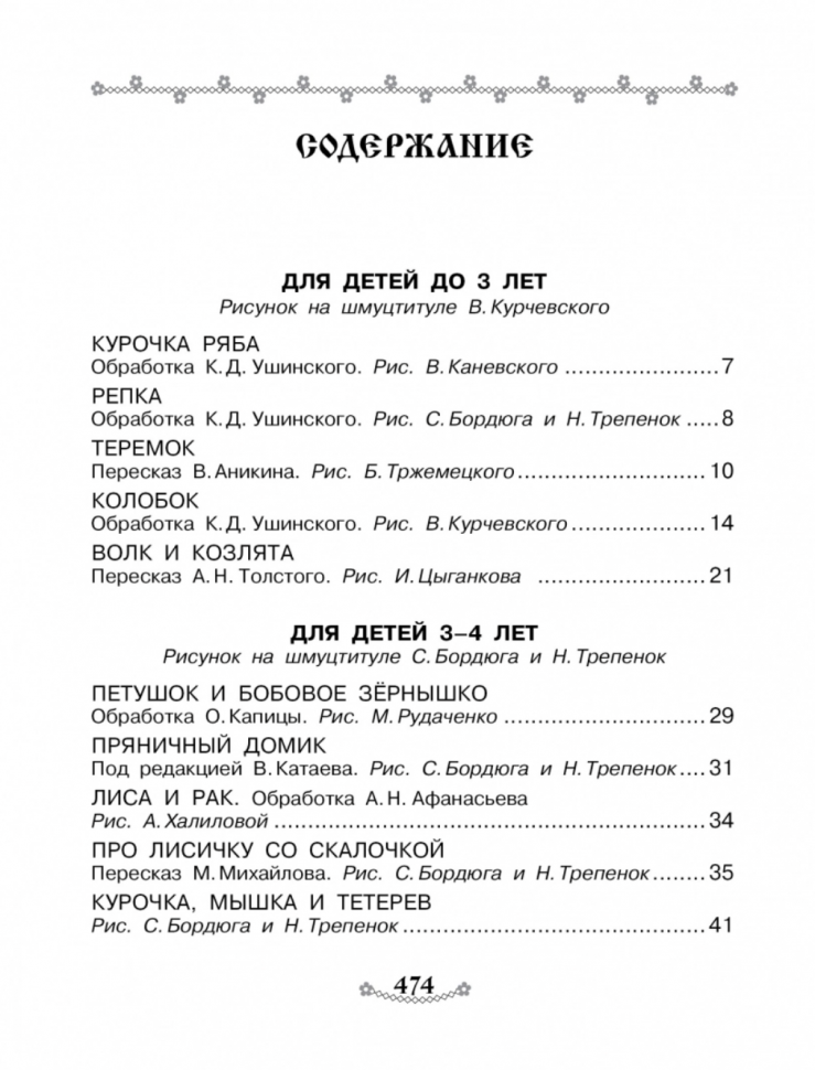 Русские народные сказки - это обязательное чтение для детей. В них собрана народная мудрость, знания о мире вокруг. Читая сказки, ребёнок учится вместе с героями различать добро и зло, находить выход из непростых ситуаций, ценить дружбу и смекалку. В сборник вошли самые знаменитые русские народные сказки в классической обработке А. Н. Толстого, А. Н. Афанасьева, К. Д. Ушинского, О. Капицы и других. Они входят в программы обязательного дошкольного чтения и чтения в школе. Для удобства читателей сказки разделены по возрастам: для детей до 3 лет, для детей 3-4 лет, для детей 4-5 лет, для детей 5-6 лет. Тексты сказок даны без сокращений.