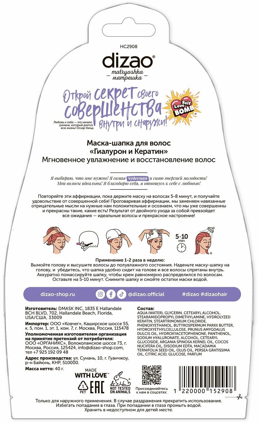 Dizao Маска-шапка для волос "Гиалурон и кератин" 40 г (Dizao ) (ЭХ99989433663)