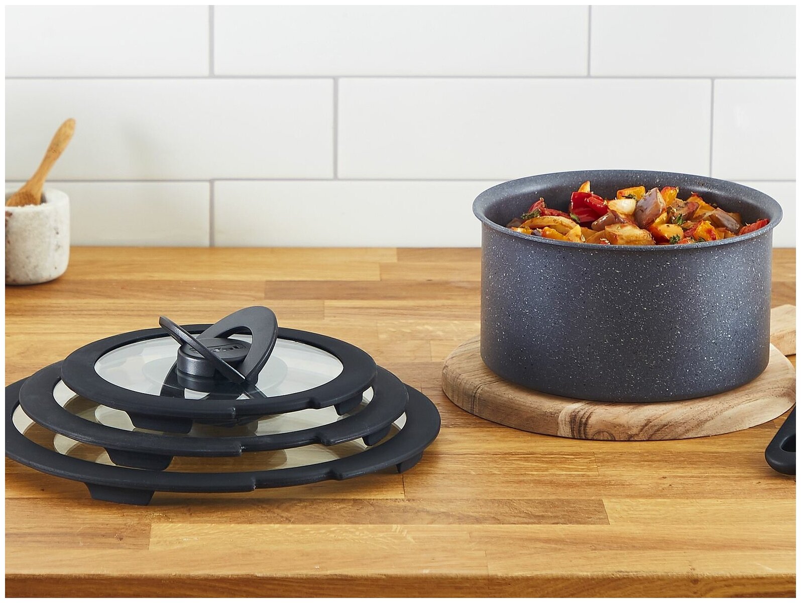 От холодильника до плиты - крышки облегчают любой этап приготовления блюд. Складные ручки для простого и удобного хранения как поодиночке, так и стопкой Полностью контролируйте готовность ингредиентов и ускоряйте их время приготовления при необходимости Полностью совместимы с линейкой Ingenio и идеально сочетаются со съемной ручкой Крышки Ingenio можно мыть в посудомоечной машине – они не займут много места благодаря складным ручкам Tefal – посуда №1 в мире*, гарантирующая идеальный результат раз за разом (*Источник: Euromonitor International Limited, издание Home and Garden 2022, данные розничных продаж бренда в денежном выражении, 2021)