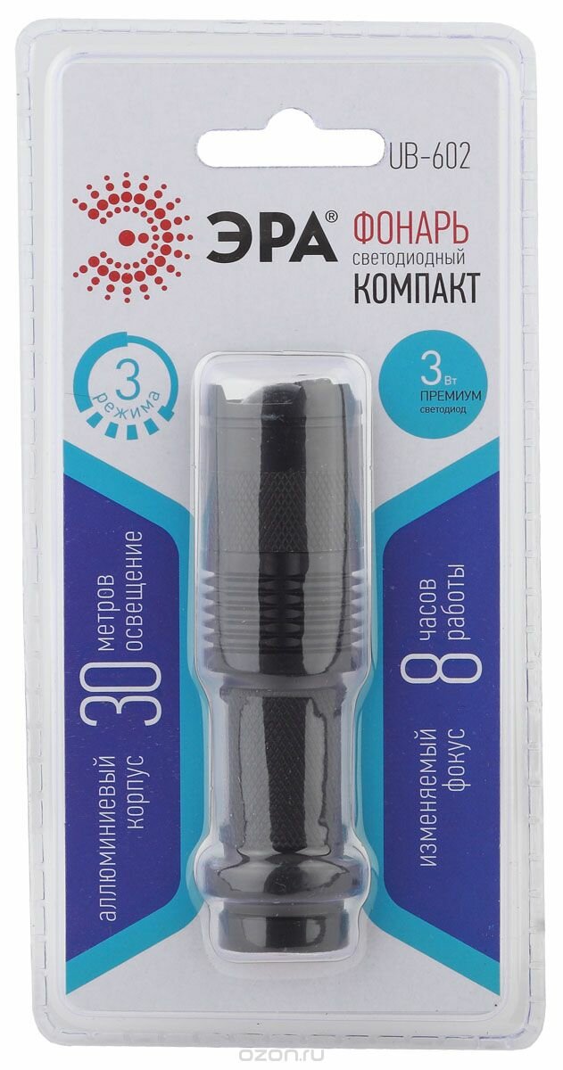 | Прочие особенности и свойства | Универсальный фонарь ЭРА UB-602 Компакт 3Вт, 1xAA, алюминий, изменяемый фокус, прищепка Б0027826 выполнен в прочном алюминиевом корпусе, имеет ручное исполнение. Оснащен клипсой для возможности переноски на поясном ремне или кармане верхней одежды. Тип лампы - 1xLED 3 Вт, регулируемый фокус. Предусмотрено 3 различных режима работы. Питание данной модели осуществляется от одной батарейки АА, которая приобретается отдельно. |
