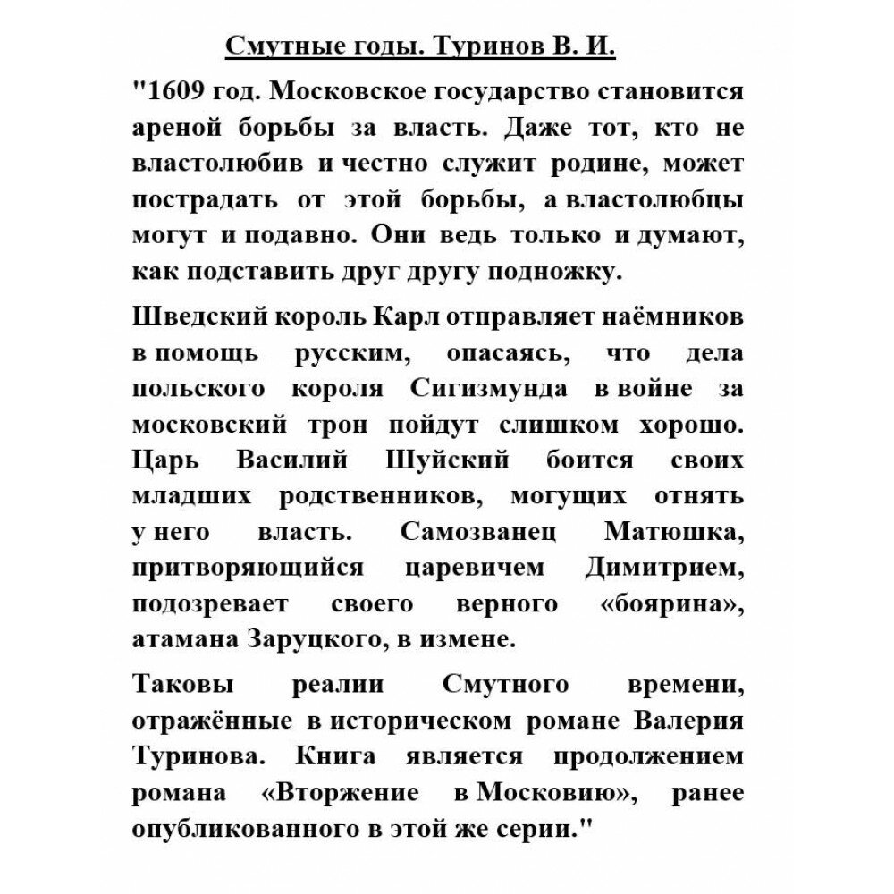 Таковы реалии Смутного времени, отражённые в историческом романе Валерия Туринова. Книга является продолжением романа "Вторжение в Московию", ранее опубликованного в этой же серии.