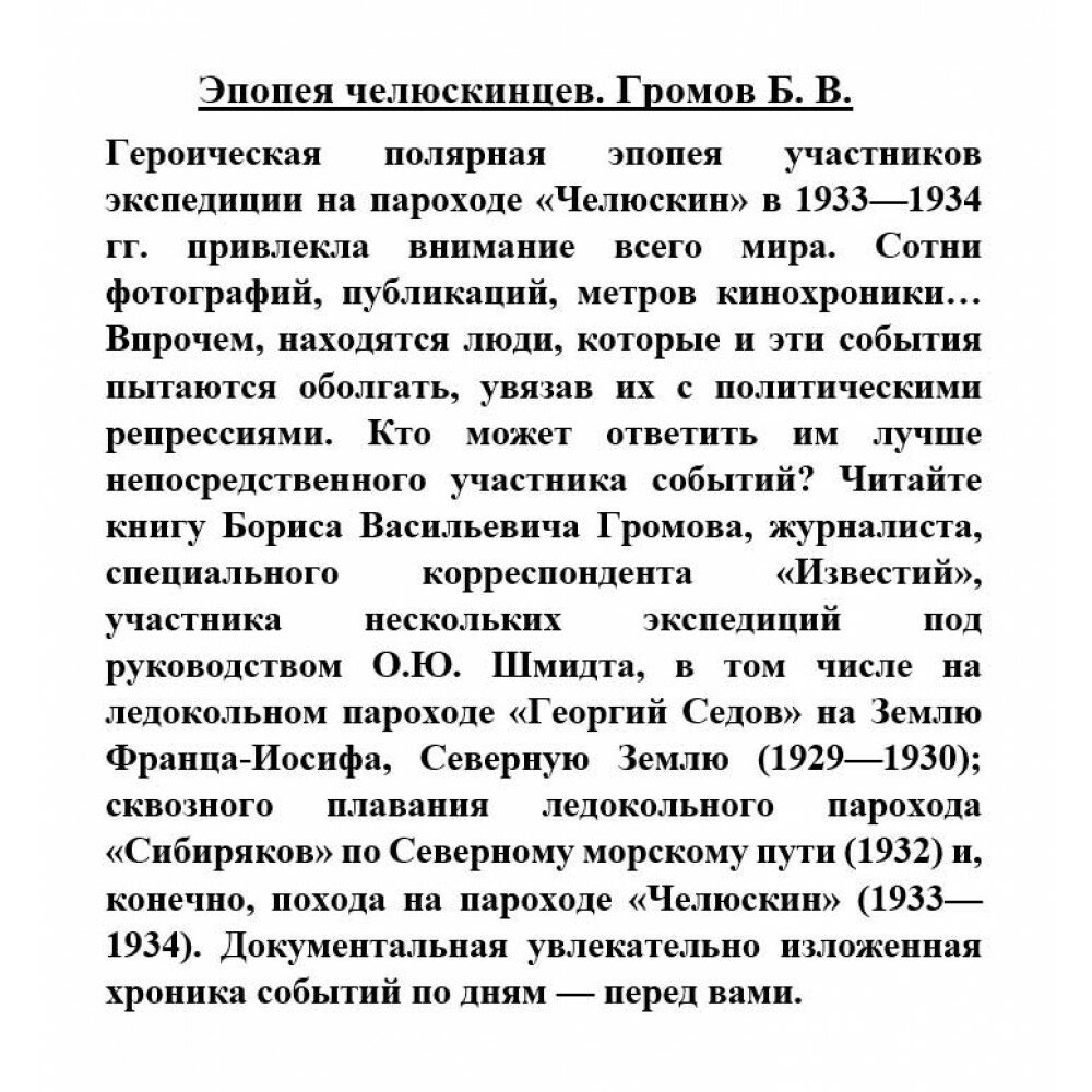 Героическая полярная эпопея участников экспедиции на пароходе "Челюскин" в 1933-1934 гг. привлекла внимание всего мира. Сотни фотографий, публикаций, метров кинохроники… Впрочем, находятся люди, которые и эти события пытаются оболгать, увязав их с политическими репрессиями. Кто может ответить им лучше непосредственного участника событий? Читайте книгу Бориса Васильевича Громова, журналиста, специального корреспондента "Известий", участника нескольких экспедиций под руководством О.Ю. Шмидта, в том числе на ледокольном пароходе "Георгий Седов" на Землю Франца-Иосифа, Северную Землю (1929-1930); сквозного плавания ледокольного парохода "Сибиряков" по Северному морскому пути (1932) и, конечно, похода на пароходе "Челюскин" (1933-1934). Документальная увлекательно изложенная хроника событий по дням - перед вами.
