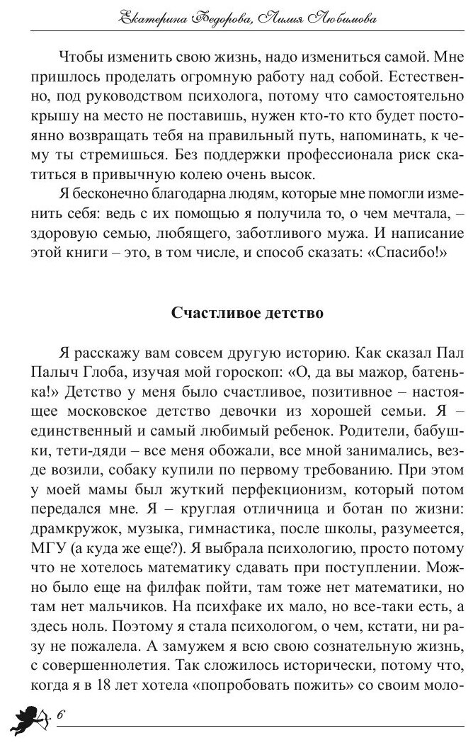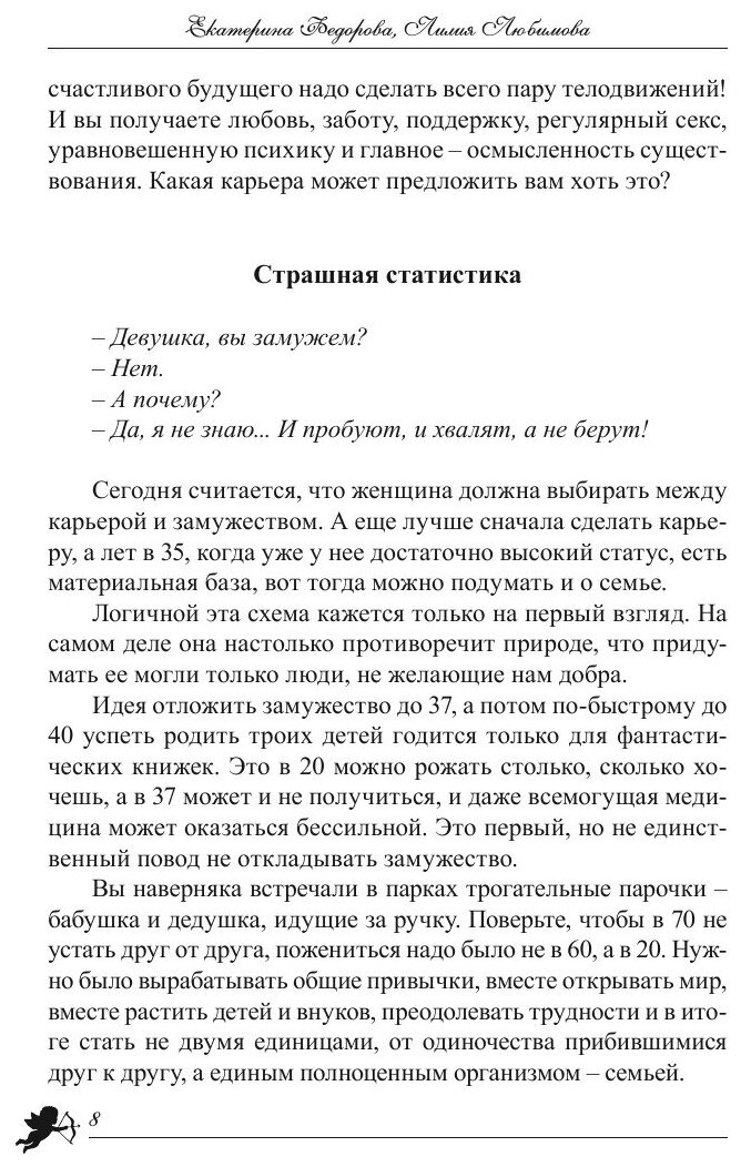 Мы пишем эту книгу вдвоем. Это наш первый опыт совместного творчества. Почему мы на это решились? Во-первых, потому, что это весело. А во-вторых, и это главное, для того чтобы быть объективными, нужно смотреть на любую проблему или задачу с разных точек зрения. И в этом смысле у нас сложилась действительно уникальная ситуация. У нас настолько разный жизненный опыт, настолько разные биографии, что даже предположить было невозможно, что во взглядах на замужество мы будем настолько солидарны. И тем не менее, идя совершенно разными путями, мы пришли к одному и тому же выводу - замуж надо обязательно! Книга, которую вы сейчас держите в руках, это и попытка поделиться своим личным опытом, и одновременно точная пошаговая инструкция, следуя которой можно построить здоровые гармоничные отношения и создать счастливую семью.