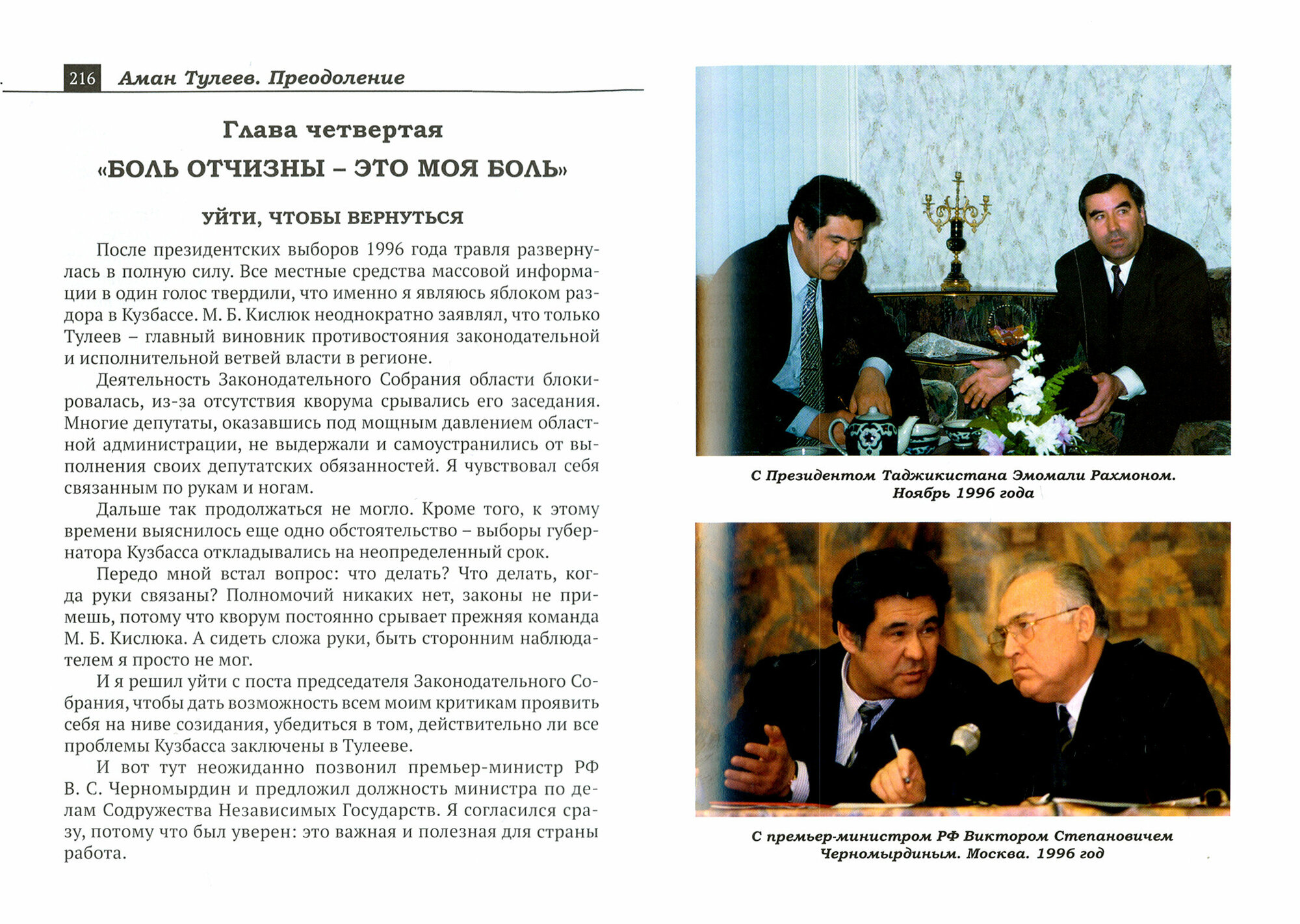 Книга "Преодоление" - это не биография А.Г. Тулеева в чистом виде, это жизнь человека и политика на срезе истории. Это автобиографическая повесть, предельно честные и искренние воспоминания о событиях в Кузбассе и стране, непосредственным участником которых был автор. Казалось бы, строгий для политика протокол биографичности и непосредственность, искренность, а, порой, и юмор в оценке самого себя, окружения и событий эпохи должны были бы плохо уживаться, но только не в случае с А.Г. Тулеевым. Именно этим книга и будет интересна самому широкому кругу читателей, она заставляет по-новому посмотреть на реалии недавнего прошлого и на судьбу одного из выдающихся деятелей современной эпохи.