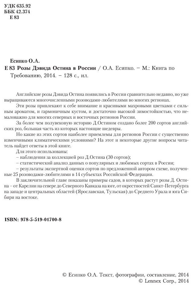 Английские розы Дэвида Остина появились в России сравнительно недавно, но уже выращиваются многочисленными розоводами-любителями во многих регионах. Эти розы привлекают к себе внимание и красивыми махровыми цветками с сильным ароматом, и гармоничным кустом, и достаточно высокой зимостойкостью, что немаловажно для многих северных и восточных регионов России. За более чем полувековую историю Д.Остином создано более 200 сортов английских роз, большая часть из которых настоящие шедевры. Но какие из этих сортов наиболее приемлемы для регионов России с существенно изменчивыми климатическими условиями? На этот и некоторые другие вопросы читатель найдет ответы в этой книге. Для этого использованы: - наблюдения за коллекцией роз Д.Остина (30 сортов); - статистический анализ данных о популярных и любимых сортах в России; - результаты экспертной оценки сортов по предложенной автором схеме, полученные 25 розоводами-любителями в 14 субъектах Российской Федерации. В заключительной главе показаны примеры садов, в которых растут розы Д. Остина - от Карелии на севере до Северного Кавказа на юге, от окрестностей Санкт-Петербурга на западе и центральных областей (Ярославская, Тульская) до Среднего Урала и юга Сибири на востоке.
