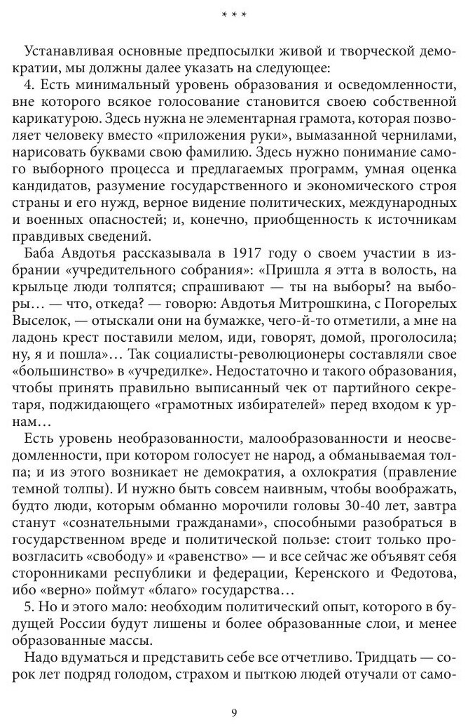 Книга включает статьи И.А. Ильина, которые конфиденциально рассылались членам Русского Обще-Воинского Союза (РОВС) и другим единомышленникам в эмиграции, подобно Ильину верившим в грядущее возрождение России. Цель этих посланий - "укрепление русского самосознания и отбор качественных сил", то есть формирование ведущего национального слоя, способного обеспечить реализацию творческих возможностей всего народа. Стержень книги составляет изложение принципов будущего государственного устройства. Главное внимание уделено вопросам духовно-нравственного воспитания и формирования правосознания граждан новой России. Воспроизводится текст парижского издания 1956 г., который для настоящего издания исправлен и дополнен в соответствии с авторскими рукописями из архива И.А.Ильина.
