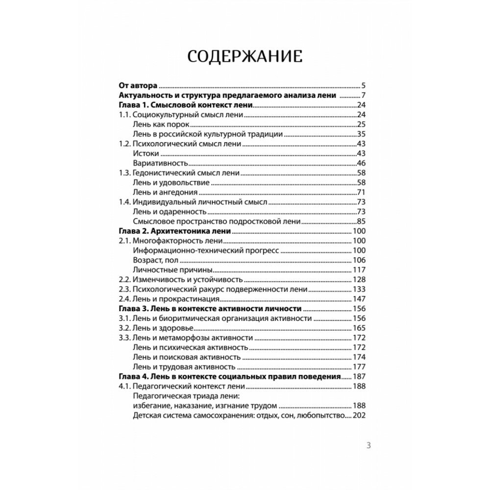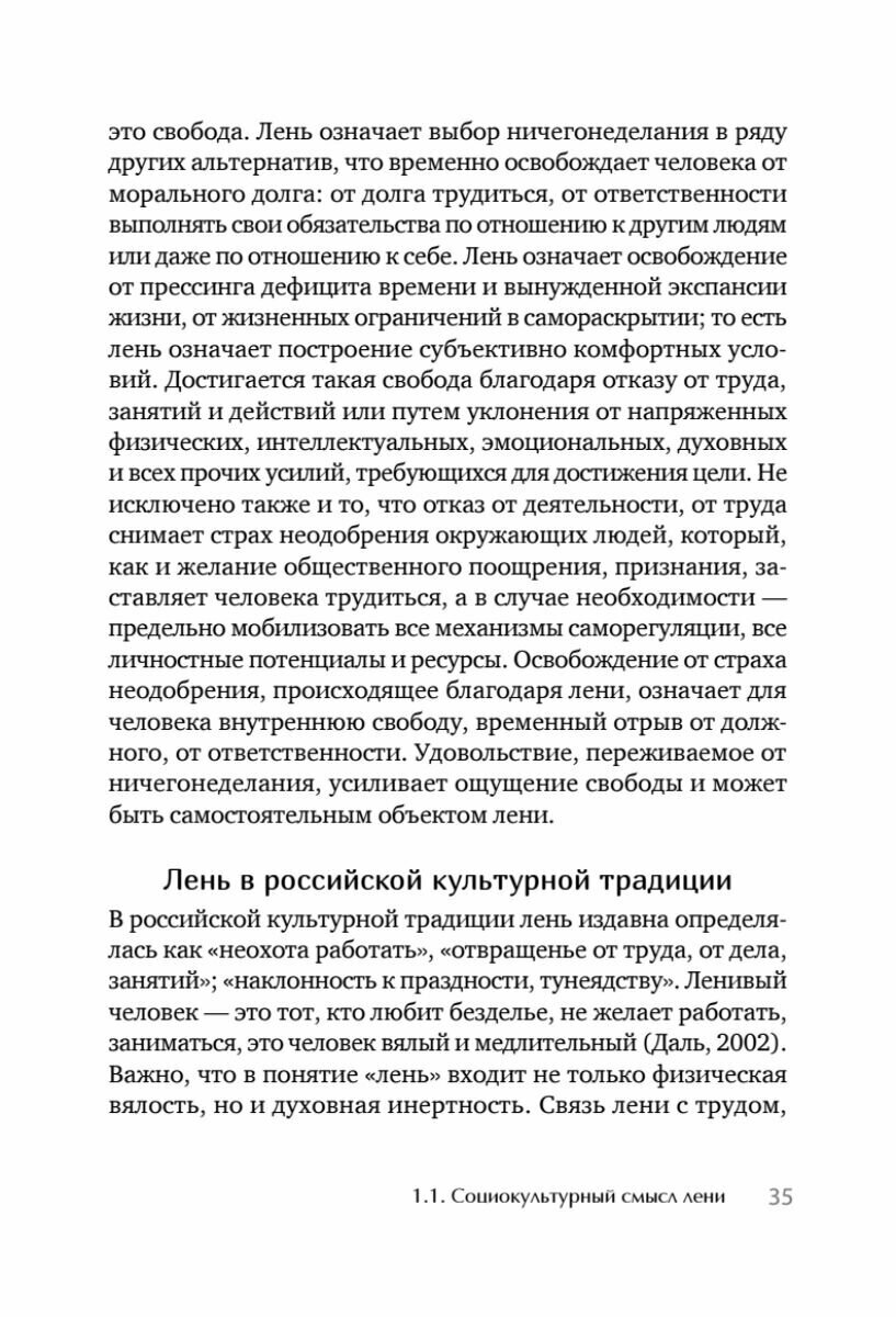 Книга объединяет культурноисторический, психологический и эмпирический анализ лени во всех значимых жизненных контекстах личности. Лень представлена в смысловом контексте, в контексте активности, социальных правил поведения и личностной саморегуляции. Во всех случаях лень проявляется как ограничение активности, вызванное желанием ничего не делать. Автором раскрыты разные виды лени, сочетающие в себе отказ от деятельности, получение удовольствия и личностную саморегуляцию: гедонистическая, ангедонистическая, ситуативная, личностно регулируемая, труднопреодолеваемая, преодолеваемая развлечениями.