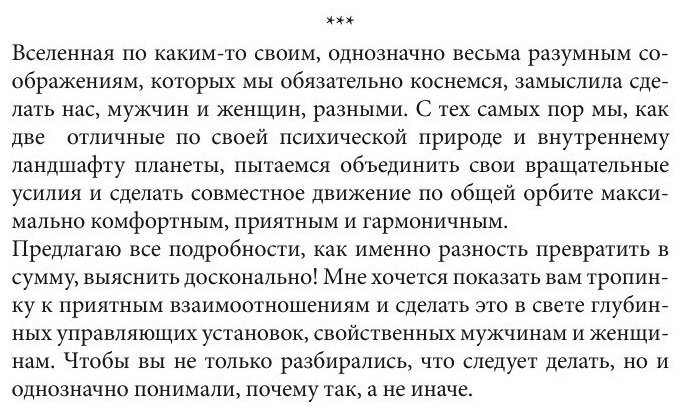 Книга адресована тем, кто ставит перед собой цель построить стабильные отношения, основанные на любви, взаимопонимании и уважении. И не важно, находится пара на грани развода, хочет оживить пресные отношения или человек в поиске подходящего партнера - пока нет постоянного спутника. Она изобилует интересными примерами разбора бытовых ситуаций, показывает глубинный смысл многих привычных действий.