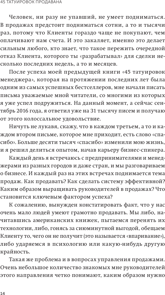 Я тоже не умел ни продавать, ни тем более управлять продажами, допускал тысячи ошибок в своей деятельности и в конце концов научился продавать много. Мне удалось стать и лучшим специалистом по продажам в своей компании, позже и лучшим руководителем отдела, а потом мы с моей командой устанавливали корпоративные рекорды и продавали больше всех в России на нашем непростом рынке. За это время у меня появились не только менеджерские, но и продаванские татуировки, которыми я решил поделиться с Вами в этой книге.